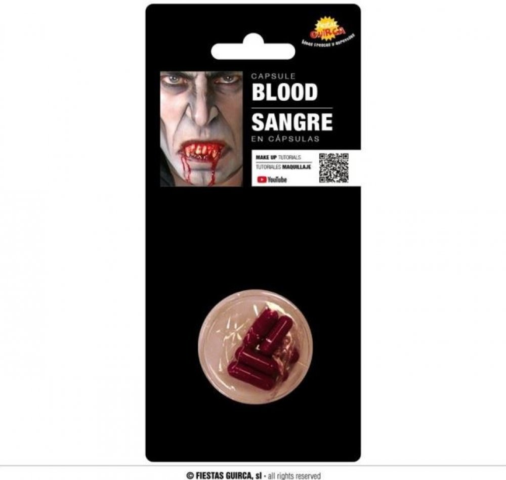 Umělá krev v kapslích, lze použít na zuby nebo na kůži, v balení 6 ks.