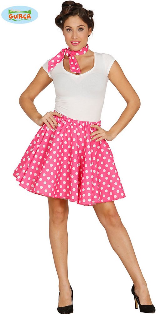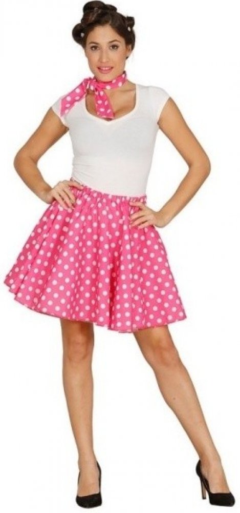 Součástí je : růžová sukně s bílými puntíky a šaten na krk nebo do vlasů ve stejném dezénu.