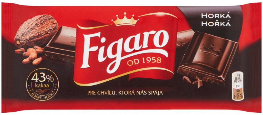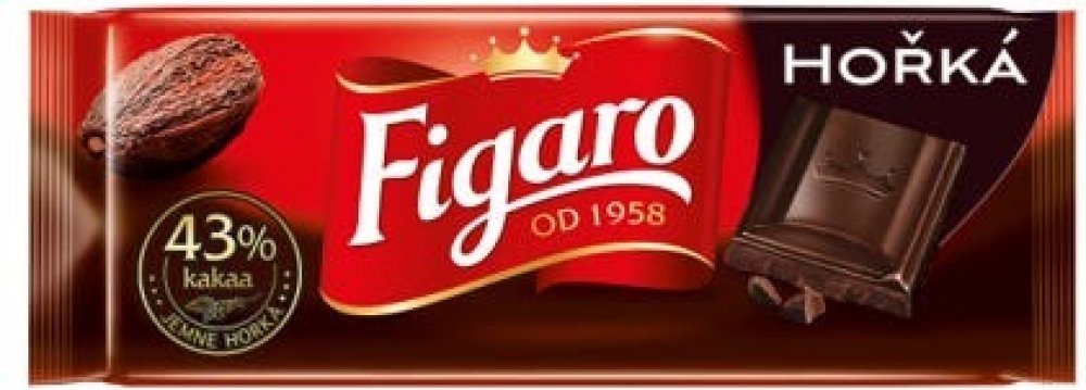 Cena se může v jednotlivých regionech lišit. -- Jemně hořká čokoláda se 43% kakaa ve znovuuzavíratelném obalu. Čokolády a bonboniéry Figaro od Mondelēz již dlouhá desetiletí voní v českých domácnostech. Milovaly je naše babičky, maminky a dnes si na nich pochutnáváme my i naše děti. Není nic cennějšího, než příjemné chvíle strávené s nejbližšími. O značce Figaro je tradiční slovenskou značkou, kte...
