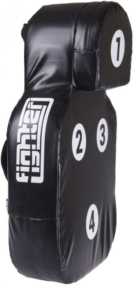 Fighter Body Shield - velký blok Velký blok Fighter je určen k nácviku kopů a úderů. Jeho univerzální použití je výjimečné. Tento velký blok můžete používat ve dvojici s partnerem, ale také jej klidně můžete připnout k zábradlí, tyči, stromu, nebo žebřinám a trénovat samostatně. Také jej můžete používat na zemi k nácvikům úderů, tak jak se cvičí v MMA nebo sebeobraně. Díky malým terčovnicím s čísly můžete trénovat přesnost a různé kombinace. Další výhodou je tvar lidského těla, díky kterému se lépe učíte cílit údery a kopy. Dále oceníte předsunutý tvar hlavy, na němž se výborně trénují údery - zvedáky, anebo kopy kolenem. Tyto charakteristické cviky na běžných lapách nebo boxerském pytli prostě nenatrénujete! Celý blok je cca 4 kg těžký, takže se s ním perfektně manipuluje. Je vyroben z tvrzeného vinylu, který můžete klidně používat v náročných podmínkách i pod širým nebem. Na tomto výrobku jsou kompletně zaoblené rohy, takže při simulaci útoků na cvičence nehrozí žádné zranění z ostrých rohů. Blok je v oblasti "těla" 15 cm silný a síla v oblasti "hlavy" je dokonce 25 cm. Taková tloušťka spolehlivě poslouží i těžkým a silným borcům.. Charakteristika Trvanlivé materiály, vinyl, tvrzený molitan, polypropylenové popruhy Univerzální použité ve dvojici či samostatně Terčovnice s čísly pro nácvik přesnosti a kombinací Tvar lidského těla Vyrobeno v ČR