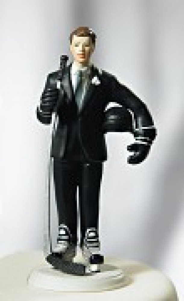 Exkluzivní svatební figurka na dort ženicha hokejisty, který vypadá jakoby si na svoji svatbu odskočil z hokejového zápasu. Ženich je oblečen v černém obleku s hokejovými rukavicemi, na nohou má brusle, v pravé ruce má hokejku a pod levou paží svírá helmu.