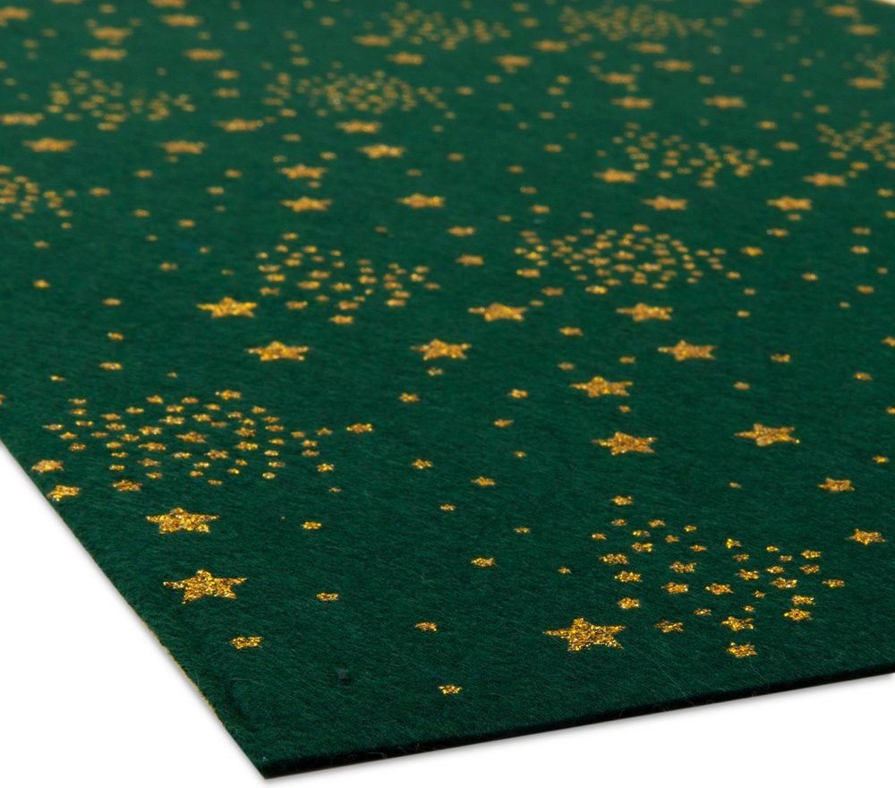 Filc / plsť vánoční motiv s hvězdami 1mm tmavě zelený je A3 plát, ze kterého můžete snadno vystřihnout různé tvary pro vaše vánoční dekorace. Díky tomu můžete vytvořit zajímavé aplikace na vánoční ozdoby nebo věnce. Připevníte je pomocí tavné pistole nebo je můžete přišít.