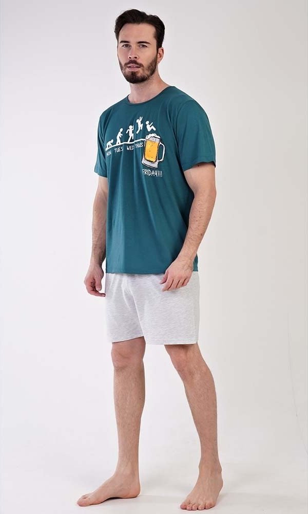 Pánské pyžamo šortky Filip. Pánské pyžamo se skládá z trička s krátkým rukávem a krátkých šortkových kalhot. Jednobarevné tričko s kulatým výstřihem je zdobeno veselým obrázkem panáčků, kteří se s blížícím víkendem nemůžou dočkat sklenice piva. Tričko doplňují jednobarevné šortky, které mají v pase gumu a šňůrku ke stažení. Nemají kapsy. Použitý materiál je příjemný a poddajný na dotek. Podíl bavl...