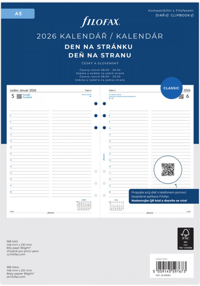 Kalendář velikosti A5 v českém a slovenském jazyce s rozložením den na jednu stranu, linkovaný s časovým plánem. K dispozici máte přehled aktuálního měsíce, týdne v roce, jmenin a státních svátků. Česky & slovensky bílý papír 80 g / m2 vhodný pro plnicí pera.