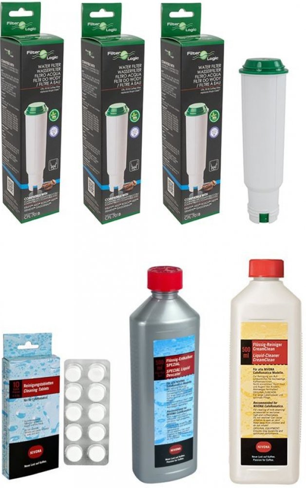 Filter Logic CFL-701B je filtr vysoké kvality zabraňující usazování vodního kamene. Model CFL-701B je kompatibilní s filtry AEG9000849514, Bosh TCZ6003 461732, Siemens TZ60003, Krups F088, Nivona NIRF700. Životnost filtru jsou dva měsíce a nebo 60 litrů přefiltrované vody. Po splnění jedné z těchto podmínek je nutné filtr vyměnit. Technické údaje:• splňuje normu EU 1935/2004;• neobsahuje BPA (Bisfenol A). Kompatibilní s kávovary:• AEG™: Cafamosa CF80, CF81, CF85, CF90, CF95, CF120, CF300, C400, CF500, EA100• Bosh™: TCA6401 benvenuto B40, TCA6709 benvenuto B65, B20-TCA6001, B30-TCA6301, B60-TCA6701, B65-TCA6709 TCA5601, TCA5608, TCA5809, TCA6801 benvenuto B7• Cocoon™: 921-F92141• Krups™: XP7200, XP7220, XP7240, XP5000, XP5050, XP5080, XP4000, XP4020, XP4050, XP4070, XP2000, XP2020, XP2050 F889, F890, F891, F892 EA8000, EA8005, EA8010, EA8025, EA8050, EA8080, EA8200, EA8220, EA8240, EA8245, EA8250, EA8255, EA8260, EA8298• Gaggenau™: CM200110, CM20011001, CM20011002, CM20011003, CM20011004, CM20013002, CM20013003, CM20013004, CM20061001, CM20061002, CM20061003, CM20063002, CM20063003, CM21011004, CM21011005, CM21011006, CM21011007, CM21013004, CM21013005, CM21013006, CM21013007, CM21071003, CM21071004• Melitta Caffeo™: Gourmet, Cl, Lattea, Bistro• Neff™: C7660N0• Nivona™: Cafe Romatica 855, 850, 845, 840, 831, 830, 777, 770, 767, 765, 757, 750, 745, 740, 730, 725, 720, 710, 650, 646, 635, 630, 626, 620, 610• Siemens™: Surpresso S20-TK60001, S40-TK64001, S45-TK64F09, S60-TK68001, S65-TK68009, S70-TK69001, S75-TK69009, TK58001, Compact TK52002Nivona NIRK703 500 ml je tekutý odstraňovač vodního kamene pro kávovary značky Nivona. Můžete být použít i pro všechny automatické kávovary jiných značek. Produkt je šetrný k materiálům, ze kterých je kávovar vyroben.Automatické kávovary značky Nivona jsou vybaveny integrovaným programem na odstraňování vodního kamene. Pravidelným odstraňováním vodního kamene šetříte vaše zařízení a prodlužujete jeho životnost. Láhev o objemu 0,5 litru vystačí na 5 čisticích procesů.Nivona NICC 705 tekutý odstraňovač zbytků mléka 500 mlPokud připravujete nápoje s mlékem, je vhodné začít pravidelně používat čisticí prostředek, který udržuje vaše zařízení v dobré kondici a nemá negativní vliv na chuť kávy. Prostředek spolehlivě odstraní zbytky mléka z okruhu, kterým mléko protéká. Díky Nivona NICC 705 si můžete pochutnat na hygienicky nezávadné mléčné pěně. Při pravidelném používání tohoto čisticího přípravku plně postačí dávkování s vodou v poměru 1:10.Nivona NIRT 701 čistící tablety 10 ks jsou určené pro automatické kávovary značky Nivona. Tablety NIRT 701 jsou speciálně vyvinuté k rozpouštění nečistot a optimálně odstraňují např. tuk z kávových zrn. Pravidelné čištění šetří váš kávovar a garantuje intenzivní aroma připravované kávy.Poznámka:• Přesný popis použití tohoto výrobku naleznete v návodu svého přístroje.Součástí balení jsou 3 ks filtru CFL-701B + 1 ks Nivona NIRK703 odstraňovač vodního kamene 500 ml + 1 ks Nivona NIRT 701 čistící tablety 10 ks + 1 ks Nivona NICC 705 tekutý odstraňovač zbytků mléka 500 ml.Bezpečnostní zdroje FilterLogic, Warwick Road, Fairfield Industrial Estate Louth, Lincs LN11 OYB, United Kingdom.Tel.: 01507 608 100, E-mail: sales@filterlogic.eusummary::-webkit-details-marker { display: none; } summary::marker { display: none; }