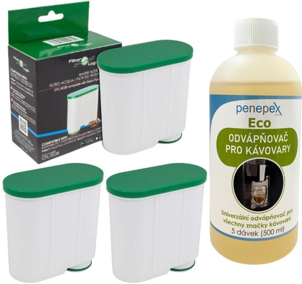 Kompletní sada pro údržbu kávovaru – 3× FilterLogic CFL‑903B + Penepex Eco odvápňovač 500 mlTato praktická sada propojuje filtry FilterLogic CFL‑903B (3 ks) určené za systémy Saeco / Philips AquaClean CA6903/00/10 a ekologický univerzální odvápňovač Penepex Eco 500 ml. Dohromady získáte sadu se kterou se postaráte o zlepšení chuti kávy, omezení tvorby vodního kamene a prodloužení životnosti vašeho kávovaru.3× FilterLogic CFL‑903B – jistota čisté vody a dokonalé chuti Filtrační patrony CFL‑903B využívají kombinaci aktivního uhlí a iontoměničové pryskyřice, která snižuje obsah chlóru, pachů a vybraných nežádoucích látek ve vodě, současně změkčuje vodu a pomáhá omezit vznik vodního kamene. Filtry jsou alternativou k systémům AquaClean CA6903 (Saeco / Philips) a podporují rovnoměrný průtok i stabilní teplotu. Tedy ty drobnosti, detaily, které jsou důležité pro správnou extrakci kávy. Čistší voda = výraznější aroma a plnější chuť nápoje. Méně vodního kamene = delší intervaly mezi odvápňováním. Jednoduchá výměna, bezpečné použití a spolehlivý výkon. Doporučený cyklus výměny: zhruba každé 2 měsíce nebo přibližně po 50 l vody (dle tvrdosti a intenzity provozu).Součástí balení je: FilterLogic CFL-903B za Saeco/Philips AquaClean CA6903/00-10 (3 ks) a Penepex Eco univerzální odvápňovač 500 ml.Penepex Eco 500 ml – šetrné, ale účinné odvápněníPenepex Eco je odvápňovač na bázi kyseliny mléčné. Je dostatečně silný na rozpuštění minerálních usazenin, ale zároveň šetrný k těsněním, kovovým i plastovým komponentům každého kávovaru. Nezanechává nežádoucí pachuť ani zápach. Po proplachu můžete bez obav pokračovat v přípravě kávy. Ekologičtější složení bez agresivních chemikálií. Pomáhá udržet topné těleso a čerpadlo v dobré kondici. 500 ml vystačí na několik kompletních cyklů údržby.Jak z této sady vytěžit maximum Nejprve filtrace: nainstalujte filtr CFL‑903B podle návodu k vašemu kávovaru a aktivujte jej proplachem. Průběžná výměna: měňte filtr podle tvrdosti vody a vytíženosti přístroje (orientačně 2 měsíce / 50 l). Odvápnění: při upozornění přístroje, změně výkonu nebo delším odstupu proveďte cyklus s Penepex Eco a následný proplach. Pravidelnost: střídáním filtrace a cíleného odvápnění udržíte stabilní chuť kávy i tichý, plynulý chod přístroje.Proč zvolit právě tuto kombinaci Kompletní péče v jednom balení – filtrace + odvápnění bez složitého výběru. Vyšší spolehlivost přístroje – méně usazenin, menší opotřebení, stabilní výkon. Lepší chuť – čistá voda nechá vyniknout kávovým tónům bez nežádoucích příchutí. Jednoduché použití – zvládnete sami, bez servisu.Hledáte jinou konfiguraci? Podívejte se na další sadyPotřebujete jiný počet filtrů nebo odlišný typ příslušenství? Projděte si další sady pro údržbu kávovaru. Najdete tam varianty pro různé potřeby – od kompaktních balení až po rozšířené sety pro dlouhodobý provoz.