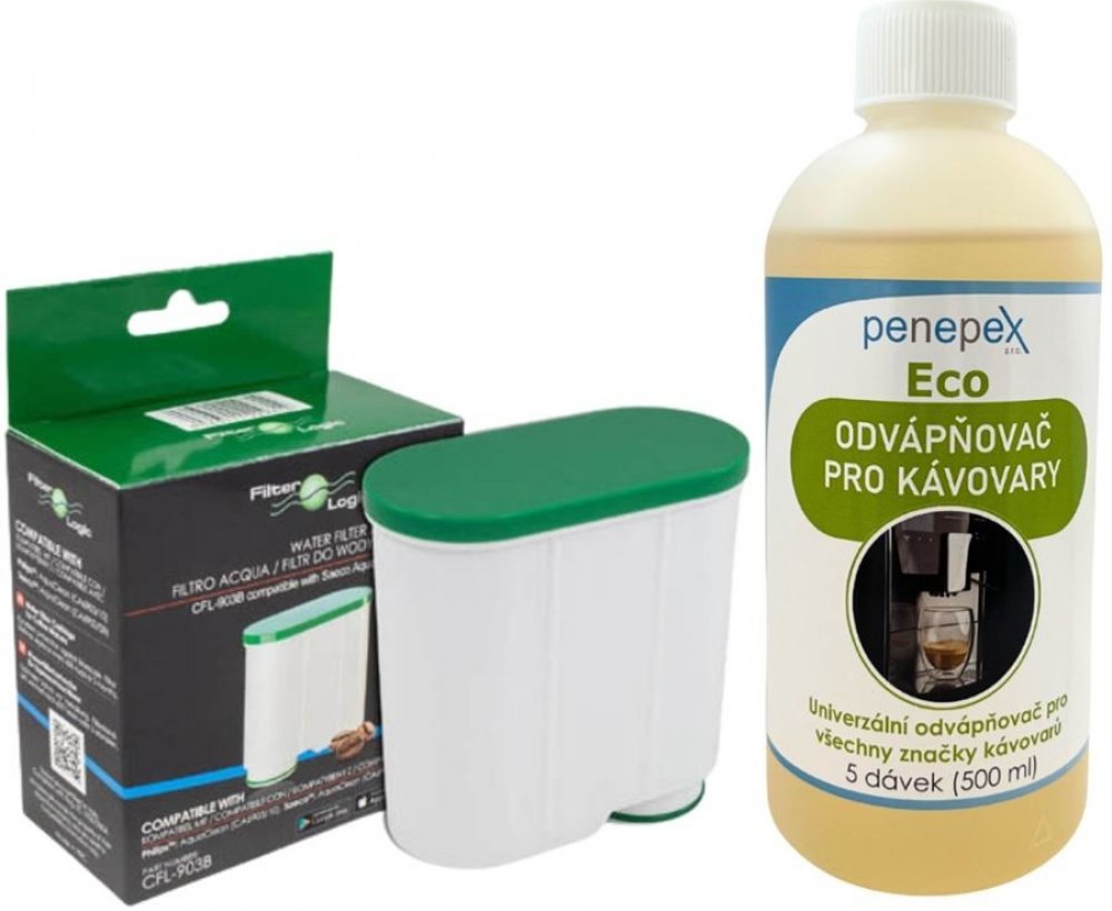 Kompletní sada pro údržbu kávovaru – FilterLogic CFL-903B + Eco odvápňovačTento set spojuje filtr FilterLogic CFL-903B a ekologický univerzální odvápňovač Penepex Eco 500 ml, čímž získáte kompletní balíček pro dlouhodobou a šetrnou údržbu vašeho kávovaru. Filtr zajišťuje čistou vodu bez nežádoucích látek, zatímco odvápňovač odstraňuje usazeniny vodního kamene. Společně tak prodlužují životnost přístroje, zachovávají plnou chuť kávy a snižují potřebu oprav.FilterLogic CFL-903B – účinná filtrace pro Saeco a Philips AquaCleanTento model filtru je určen pro kávovary Saeco a Philips s technologií AquaClean CA6903. Uvnitř filtru se nachází kombinace aktivního uhlí a iontoměničové pryskyřice, které: odstraňují chlór, těžké kovy a další nežádoucí látky z vody, snižují tvrdost vody, a tím minimalizují tvorbu vodního kamene, zachovávají minerály prospěšné pro výslednou chuť kávy, prodlužují interval mezi odvápňovacími cykly.Každý filtr poskytuje optimální výkon po dobu přibližně 2 měsíců nebo na 50 litrů přefiltrované vody. Používání originálních či kvalitních alternativních filtrů, jako je CFL-903B, je klíčové pro udržení čistoty vody a ochranu citlivých částí kávovaru.Kompatibilní za filtry: Philips / Saeco AquaClean CA6903 (CA6903/00, CA6903/10, CA6903/22).Krátký seznam kávovarů kompatibilních s filtrem: EP2224/10, EP2235/40, EP3241/50, EP3243/50, EP5334/10, EP5345/10, SM3061/10, SM5460/10, SM5570/10, SM5572/10, SM7480/00, SM7581/00, SM7680/00,SM7686/00,EP2236/40, EP4343/50, EP4349/70, EP5441/50, EP5444/90, HD8924/09, HD8925/09, HD8926/09, HD8927/09.*Technické údaje:• životnost filtru - 3 měsíce nebo kapacita až 600 šálků kávy;• splňuje normu EU 1935/2004;• neobsahuje BPA (Bisfenol A);• filtrační složky - aktivní uhlí, iontoměničová pryskyřice;• certifikáty - splňuje evropskou normu Reg. (ES) 2004/1935, BPA FREE, NIZP PZH – PIB (Národní ústav hygieny).Penepex Eco – šetrné a účinné odvápněníPenepex Eco je univerzální ekologický odvápňovač na bázi kyseliny mléčné, která je dostatečně silná na odstranění minerálních usazenin, ale zároveň šetrná k těsněním, kovovým i plastovým částem přístroje. Tento přípravek: neobsahuje agresivní chemikálie, nezanechává nepříjemný zápach ani pachuť, je bezpečný pro domácí i profesionální použití, v 500ml balení vystačí na několik odvápňovacích cyklů.Pravidelné odvápňování zajišťuje rychlý ohřev vody, tichý chod přístroje a prodlužuje životnost topného tělesa i čerpadla.Výhody této kombinace Kompletní péče o kávovar v jednom balení. Ochrana proti vodnímu kameni a mechanickému opotřebení. Zachování plného aroma a chuti kávy díky čisté vodě. Ekologický a bezpečný způsob údržby.Další varianty sad pro údržbu kávovaruPotřebujete jiný typ filtru nebo jiný počet kusů? Podívejte se na celou nabídku sad pro údržbu kávovarů, kde najdete řešení pro různé značky, modely a intenzitu používání.Součástí balení je: FilterLogic CFL-903B za Saeco/Philips AquaClean CA6903/00-10 (1ks) Penepex Eco univerzální odvápňovač 500 ml.