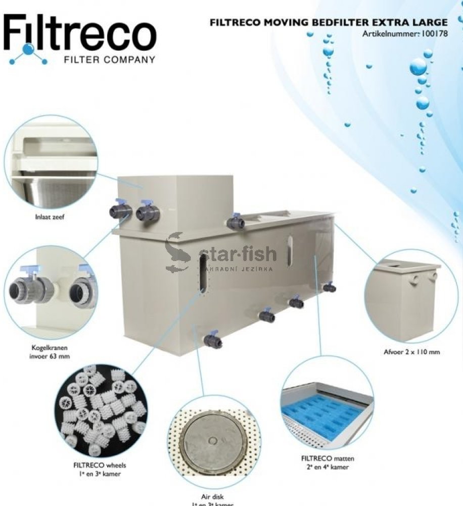 Kombinované Filtreco Moving Bed filtry kombinovaný mechanicko-biologický filtr, štěrbinový filtr zajistí kvalitní odstranění hrubých nečistot a druhá část filtru obshující 4 komory - moving bed zajistí efektivní biologické čištění, které pokračuje v komoře osazené filtračními molitany, další komora s moving bed a na závěr opět komora s molitany tento systém vyniká svou jednoduchostí a je ideální pro jezírka s chovem Koi, vyvinut speciálně pro chov koi vysoká spolehlivost, výkon, nízká spotřeba energie a jednoduché použítí jsou povinností filtry jsou určené pro čerpadlové napojení Filtrační materiál v těchto filtrech je založen na volně plovoucích, filtračních "kolečkách", které využívají sofistikovaný air-lift systém a jsou tak neustále v pohybu. Povrch těchto médií je přibližně 800 m2/1m3.Díky neustálému pohybu filtračních "koleček" je zajištěn optimální kontakt mezi vodou a bakteriemi, které biologicky čistí vodu.Systém air-liftu má kromě pohybové funkce pro média i důležitou okysličovací funkci v celém systému, je tak zajištěn dostatečný přísun kyslíku do vody. Filtreco moving bed filtry jsou vybaveny dostatečným množství filtračních "koleček", provzdušňovacím diskem a štěrbinovým sítem 300-200 mikronů o rozměrech 71,5 x 40 cm. Filtr je velice kompaktní a nezabere moc místa. Filtr Filtreco Moving Bed extra large je vhodný pro jezírka do 75 m3. Dodávka obsahuje štěrbinový předfiltr a 4 komorovou biologickou filtraci (1. komora airlift s "kolečky", 2. komora s filtračními molitany,3. komora airlift s "kolečky", 4. komora s filtračními molitany), víka, 5x kulový ventil 50mm, 2x kulový ventil 63mm, 200 l medií Filtreco Wheels. Uvedená cena je včetně filtračních médií