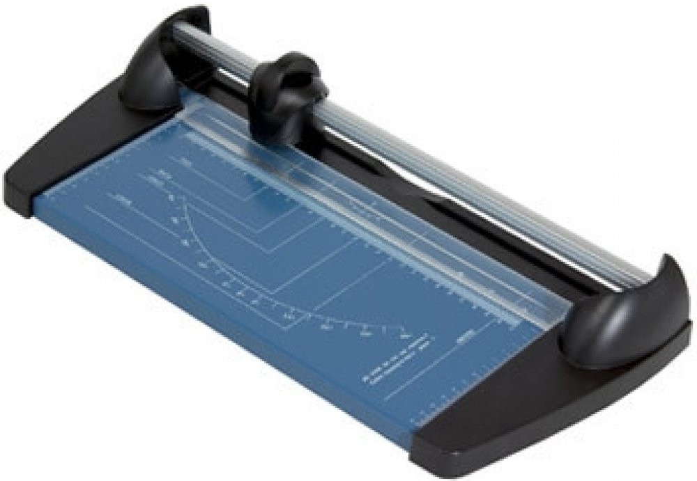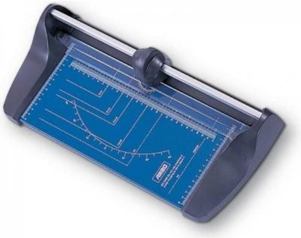 Řezačka díky své konstrukci uřízne bez problémů 10 listů papíru. Kotoučová řezačka s broušeným kolečkem na profilované tyči s délkou řezu 330 mm. Pracovní stůl je vybaven natištěnými měřítky a úhly a přítlačnou lištou z průhledného plastu.
