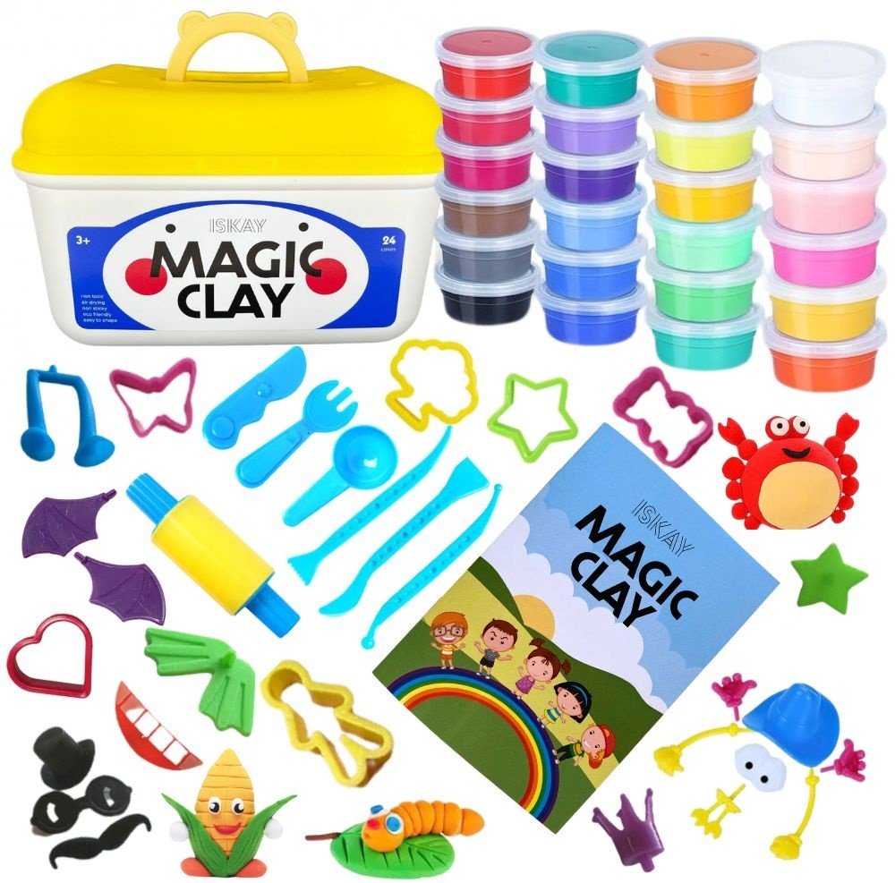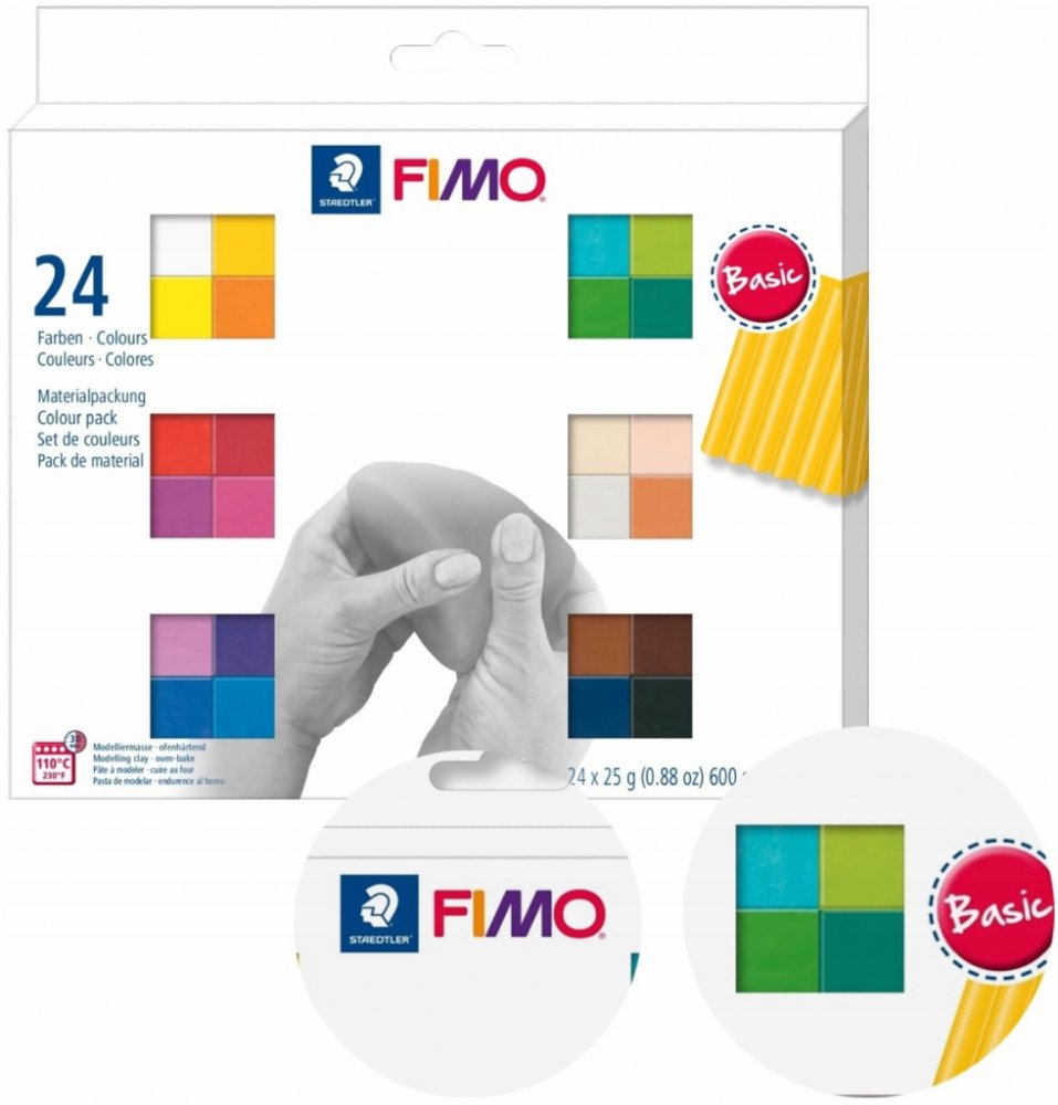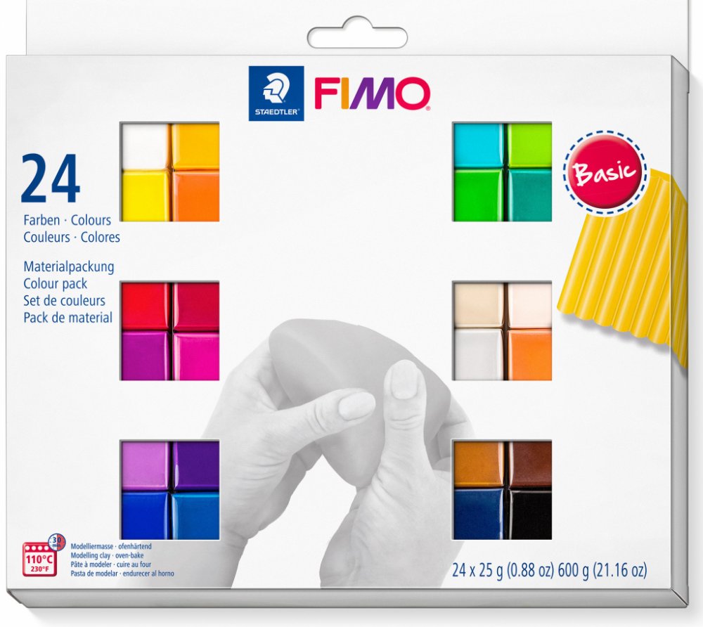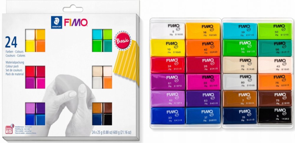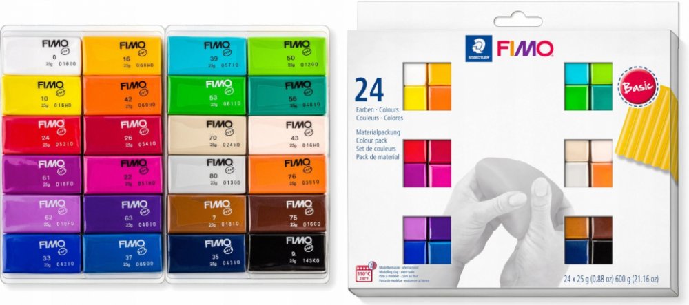 FIMO Soft sada 24 barev obsahuje 24 půlbloků Fimo soft 25g.Fimo hmota je polymerová hmota která je vyrobená z umělých modelovacích materiálů, složených z polyvinylchrloridů, gelů, pryskyřic, byrviv a změkčovadel. Díky své tvárnosti můžeme polymerovou hmotu tvarovat do nejrůznějších tvarů, ze kterých se dají vyrábět šperky či dekorativní nebo bytové doplňky. Fimo je lehká a měkká hmota, která Vás svou dokonalostí scela ohromí. Snadné modelování s následným zapečením v troubě při 110°C. Fantazii se meze nekladou, takový výběr barev má pouze Fimo hmota. Všechny hmoty jsou zdravotně nezávadné.