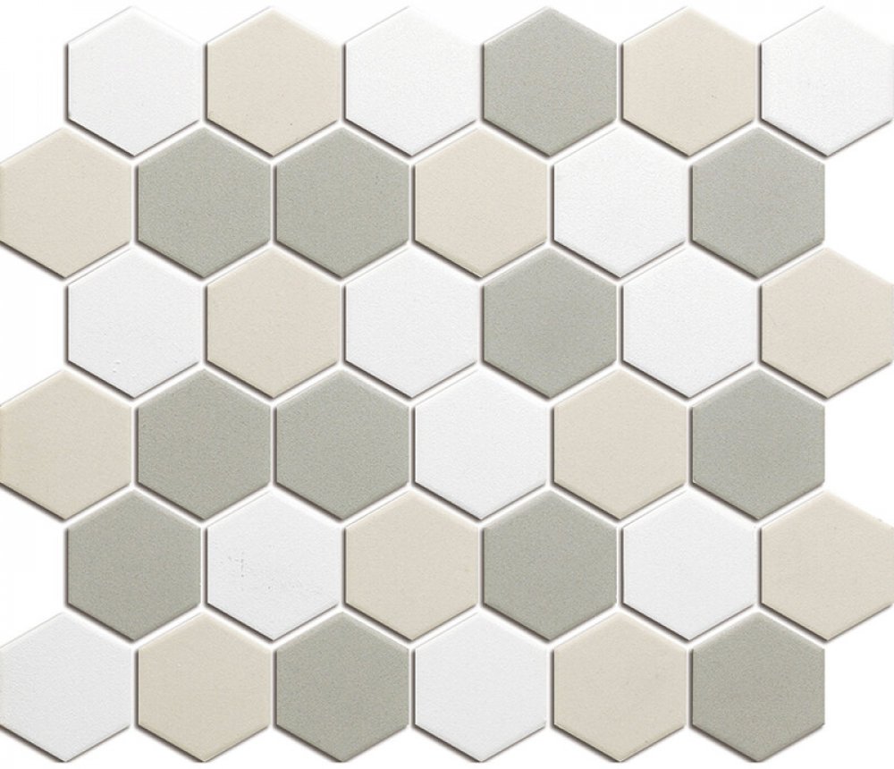 Keramická mozaika LOH10MIX2 kombinuje moderní vzhled, vysokou odolnost a bezpečný matný protiskluzný povrch. Mix bílé, šedé a béžové vytváří přirozený, harmonický a velmi univerzální vzhled, který se snadno začlení do světlých i tmavších interiérů. Hexagonální formát 5,1 × 5,9 cm dodává celku elegantní geometrii a nadčasový design.