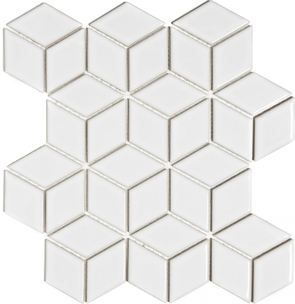 Keramická mozaika PACU100 přináší do interiéru výrazný geometrický efekt díky svému kosočtvercovému tvaru 4,8 × 8,3 cm, který po položení vytváří atraktivní 3D iluzi prostorové krychle. Lesklý bílý povrch ještě více zvýrazňuje světelné odlesky a zvýrazňuje plastický vzhled celé mozaiky. Tento typ obkladu je ideální pro ty, kdo hledají originální, dynamický a moderní design.