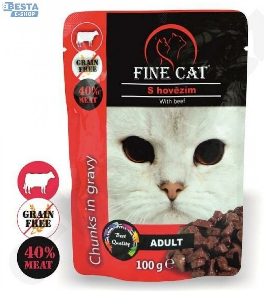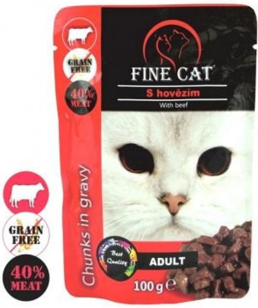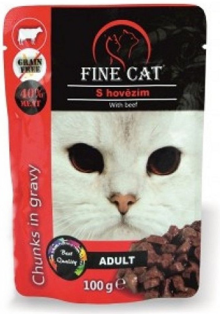 Fine Cat kapsička grain-free Adult hovězí v omáčce je kompletní bezobilné krmivo ve formě kousků v omáčce určené pro dospělé kočky.