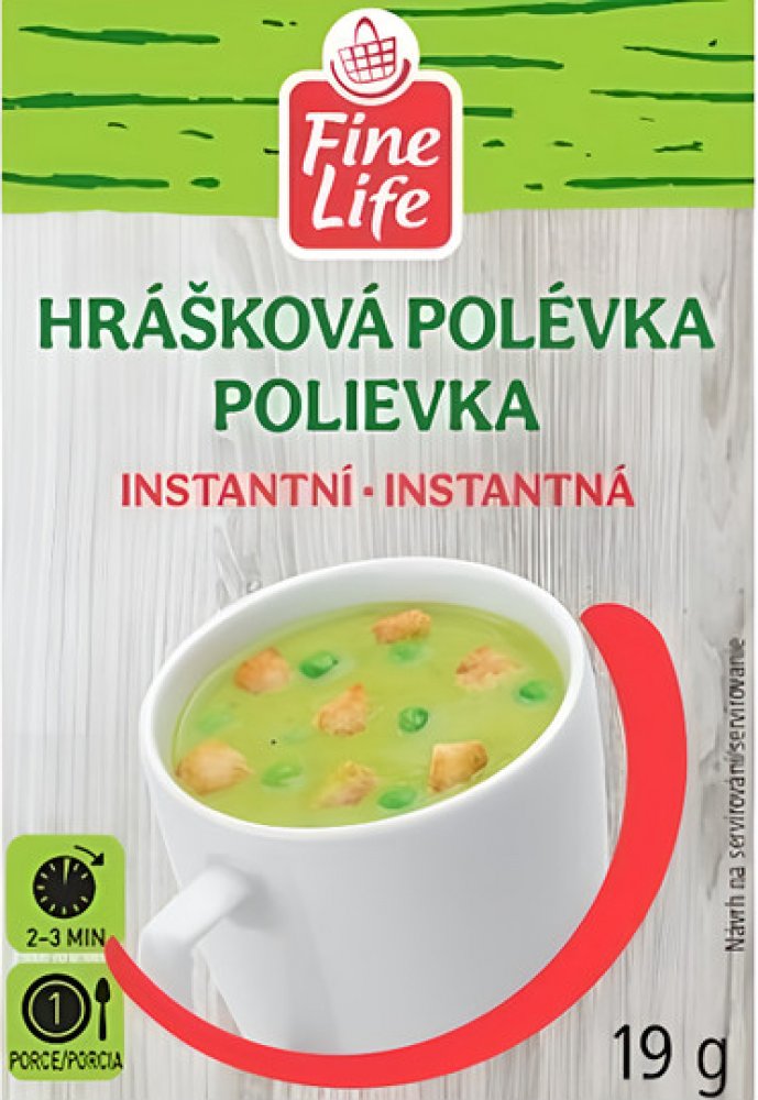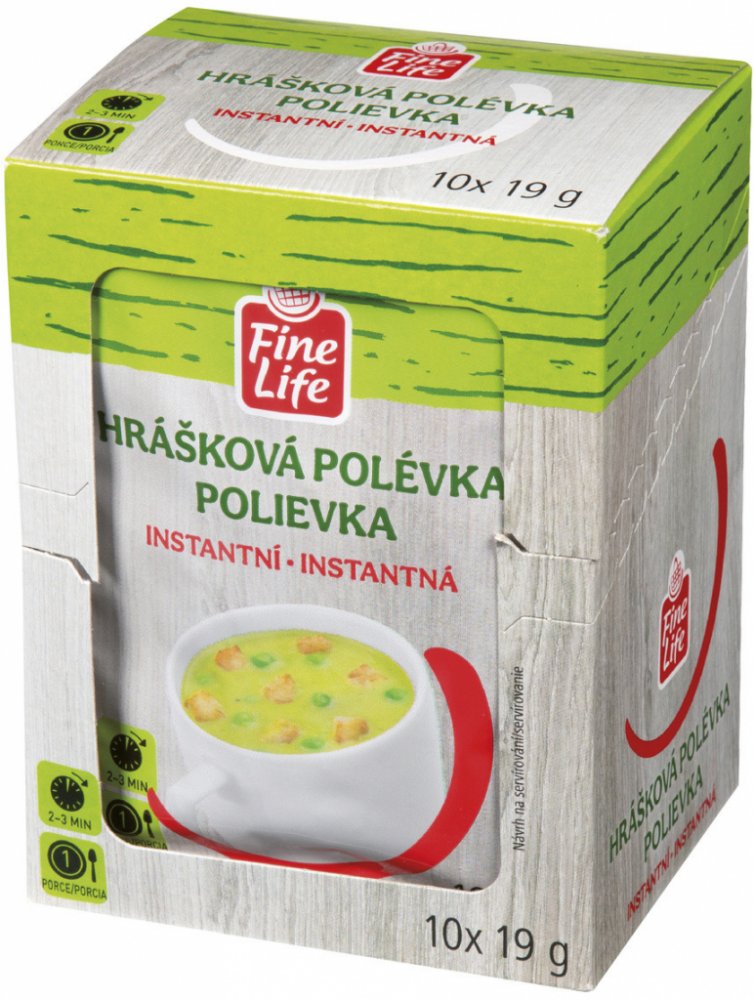 -- Fine Life Polévka instantní hrášková 19 g.Návod na přípravu:Obsah sáčku zalijte 0,2 l vroucí vody, řádně zamíchejte a nechte 2-3 minuty odstát. Podávejte.O značce:Značková kvalita FINE LIFE na vašem stoleZa produkty, které jsou srovnatelné se…
