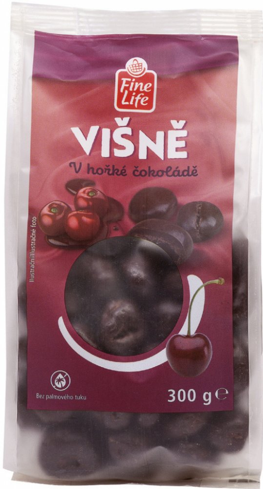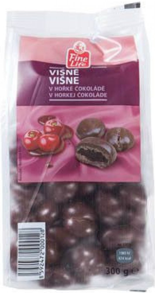 ZÁKONNÝ NÁZEV POTRAVINYKANDOVANÉ VIŠNĚ V HOŘKÉ ČOKOLÁDĚSLOŽENÍhořká čokoláda (63 %) (cukr, kakaová hmota, kakaové máslo, rostlinné tuky (palmový olej, olej z máslovníku, Sal, Illipe, Kokum gurgi, olej z jader manga, v různém poměru), MLÉČNÝ TUK, emulgátory: slunečnicový lecitin a polyglycerylpolyricinooleát; aroma), kandované višně (35 %) (cukr, višně, dextróza, pitná voda), lešticí směs (tapiokov...