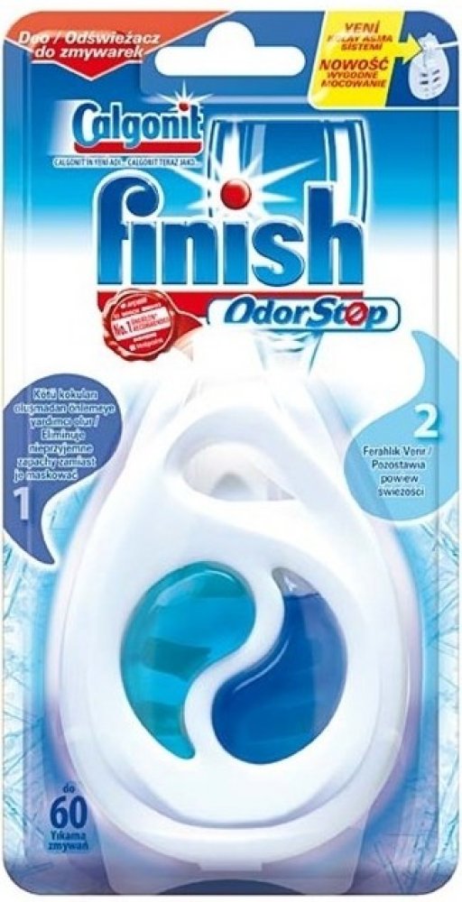 Dodejte vaší myčce nádobí svěžest Speciální dvojité komory osvěžovače myčky Finish Odor Stop účinkují současně a vy tak při každém otevření myčky nádobí ucítite místo nepříjemných zápachů jen osvěžující aroma Odvežovač zápach pouze nemaskuje ale naprosto ho odstraní POUŽITÍ Připevněte Finish osvěžovač na koš v myčce nádobí nebo jej zavěste na vrchní přihrádku tak aby nedošlo k zablokování...