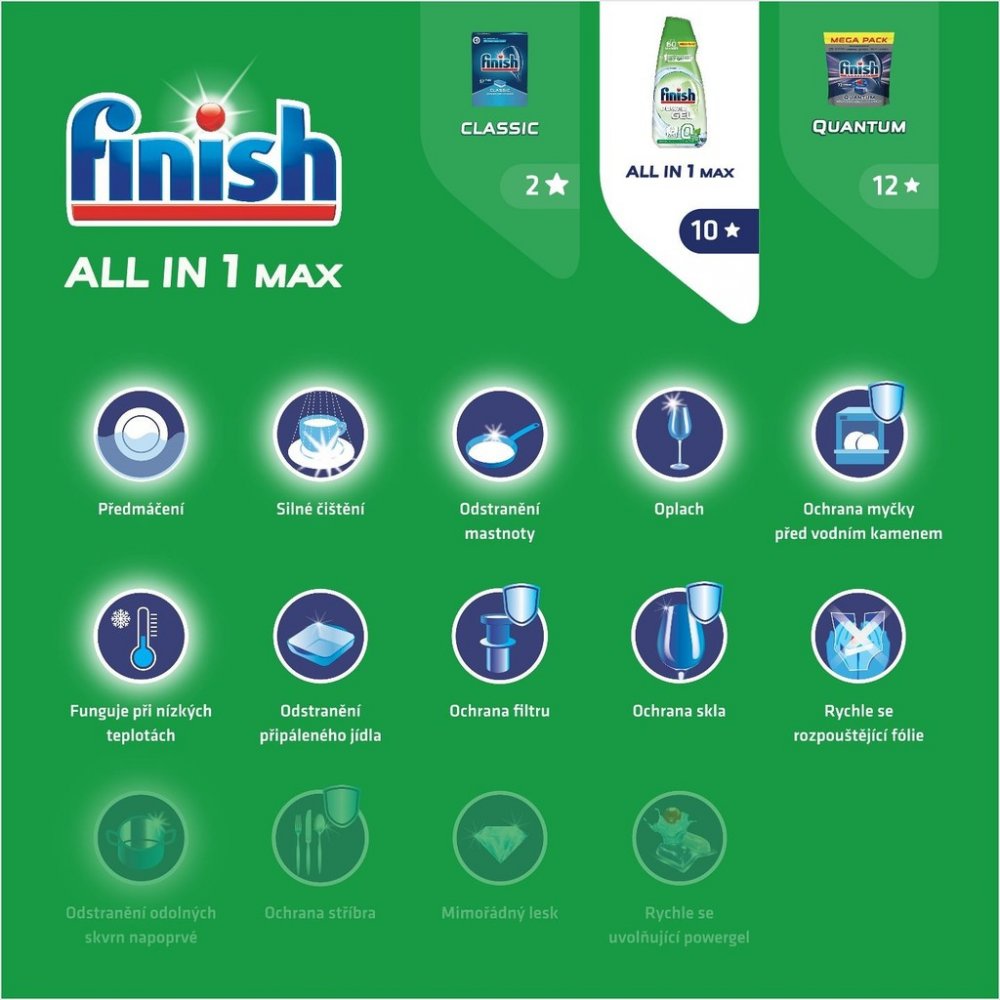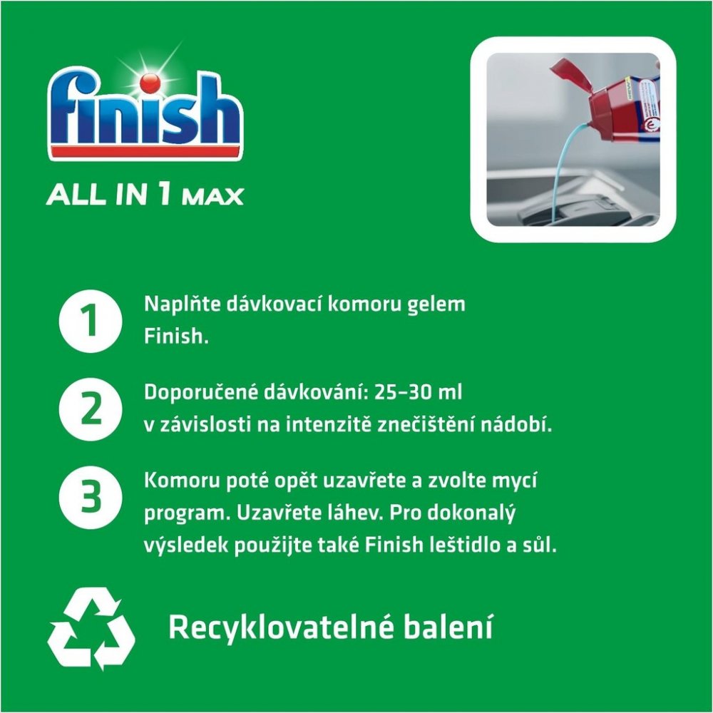 Využívá sílu gelu Finish All in 1 Max, takže do myčky již není nutné přidávat ani sůl, ani leštidlo (sůl a leštidlo doporučujeme ale přidávat pokud žijete v oblastech s tvrdou vodou). Dokonale čisté nádobí zaručuje i při ekologických mycích cyklech s teplotami 50–55 °C, které jsou méně náročné na spotřebu elektrické energie a vody. Gel je držitelem certifikátu Ecolabel.