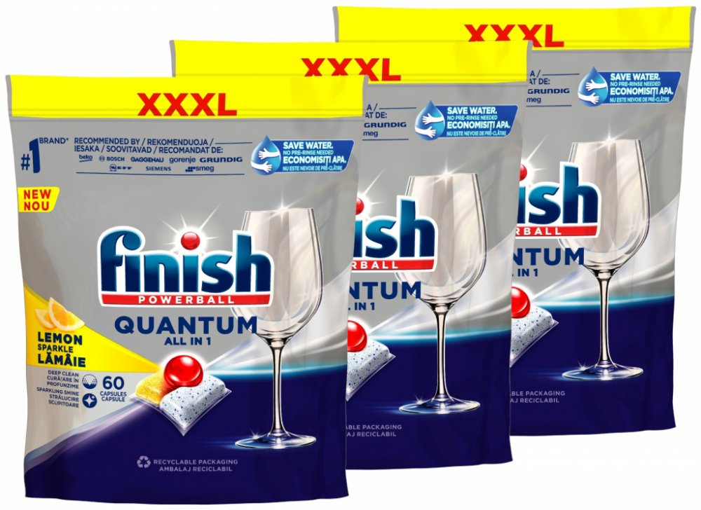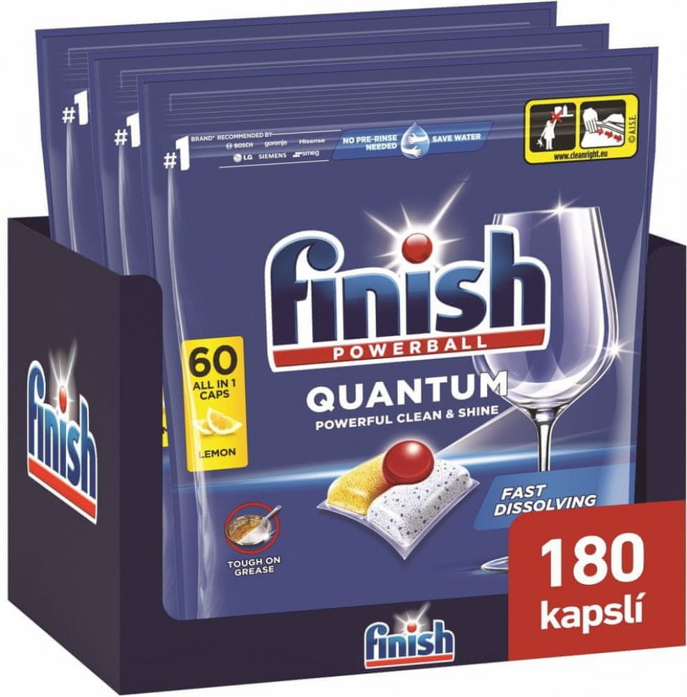 Kapsle do myčky Finish Quantum All In One LemonFinish Quantum All in 1 Lemon dopřeje vašemu nádobí zářivý lesk a čistotu hned napoprvé. Tříkomorové složení účinně odstraní všechny druhy nečistot pocházejíích od jídla, a to i bez předmývání. Doporučují tito výrobci myček nádobí: Kapsle do myčky Finish - klíčové vlastnostiDiamantový leskJiž po prvním umytí bude vaše nádobí zářit oslnivým leskem.Všechny druhy nečistot bez předmýváníEfektivní proti všem druhům nečistot i bez předmývání.RecyklovatelnéObal kapslí Finish Quantum All in 1 je biologicky rozložitelný a 100% rozpustný ve vodě.Návod k použitíZbytky nečistot seškrábejte před naplněním myčky do odpadkového košeKapsli vyjměte suchýma rukama a vložte do zásobníku vaší myčky. Nerozbalujte ji, ani nerozdělujte. Nevkládejte produkt do košíku n na příbor.Zásobník uzavřete a vyberte vhodný program pro mytí. Nejlepších výsledků dosáhnete při teplotě 50/55 °C nebo na automatický program.Pro nejlepší výsledky použijte také Finish leštidlo a sůl.Bezpečnost a...