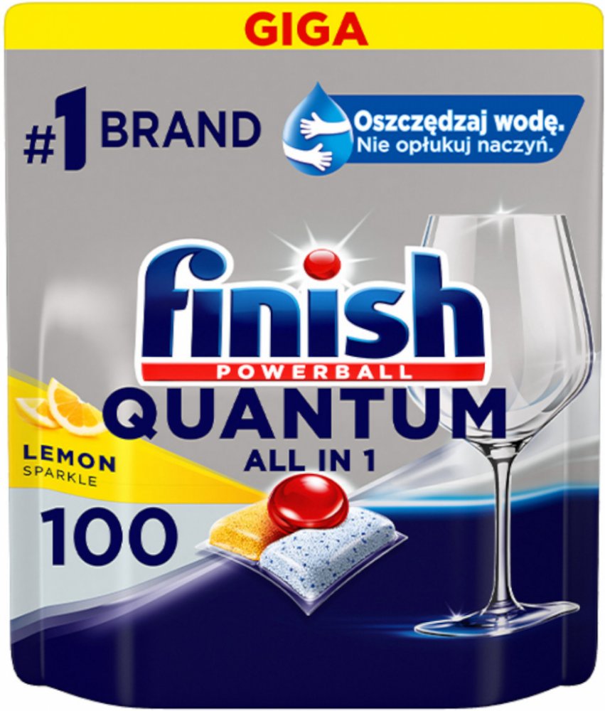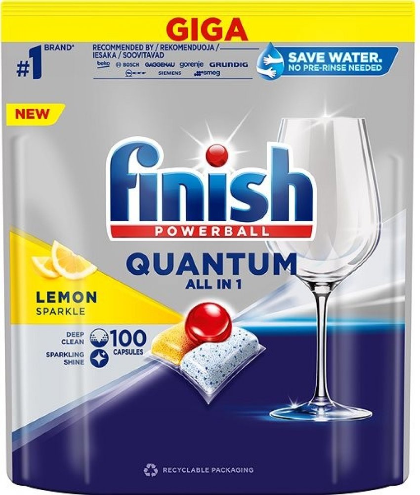 Finish Quantum All in 1 Lemon Sparkle tablety do myčky 100 ks jsou vysoce účinné gelové kapsle navržené pro dokonalé čištění a lesk vašeho nádobí. Díky tříkomorovému složení odstraňují i zaschlé nečistoty a mastnotu bez nutnosti předmývání. Jejich složení také chrání sklenice před korozí a zabraňuje usazování vodního kamene v myčce. Tablety jsou biologicky odbouratelné a ve vodě rozpustné, což zajišťuje ekologickou šetrnost. Hlavní vlastnosti: Tříkomorové složení: kombinuje prášek, gel a Powerball pro maximální účinnost. Účinnost bez předmývání: odstraňuje i zaschlé zbytky jídla. Ochrana skla a stříbra: chrání před korozí a poškozením. Prevence vodního kamene: zabraňuje usazování a chrání myčku. Ekologické složení: biologicky odbouratelné a ve vodě rozpustné kapsle. Svěží citronová vůně: zanechává nádobí příjemně provoněné. Složení Kapsle obsahují: 5 % nebo více, avšak méně než 15 % neiontových povrchově aktivních látek bělicí činidla na bázi kyslíku fosfonáty polykarboxyláty enzymy (subtilisin, amylasa) parfémy (benzylbenzoát, geraniol, limonen)Bezpečnostní upozornění produktu (H-věty)H319: Způsobuje vážné podráždění očí.Pokyny pro bezpečné zacházení (P-věty)P101: Je-li nutná lékařská pomoc, mějte po ruce obal nebo štítek výrobku.P102: Uchovávejte mimo dosah dětí.P103: Před použitím si přečtěte údaje na štítku.P264: Po manipulaci důkladně omyjte všechny zasažené části těla, například ruceP280: Používejte ochranné rukavice/ochranný oděv/ochranné brýle/obličejový štít.P305+P351+P338: PŘI ZASAŽENÍ OČÍ: Několik minut opatrně vyplachujte vodou. Vyjměte kontaktní