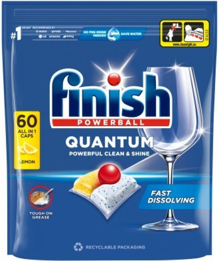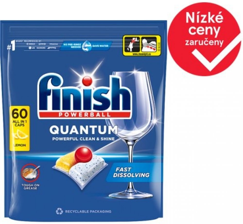 Vyzkoušejte nejnovější kapsle Finish Quantum do myček. Tento inovativní produkt zajišťuje dokonalé výsledky čištění a zanechává vaše nádobí dokonale čisté a lesklé.