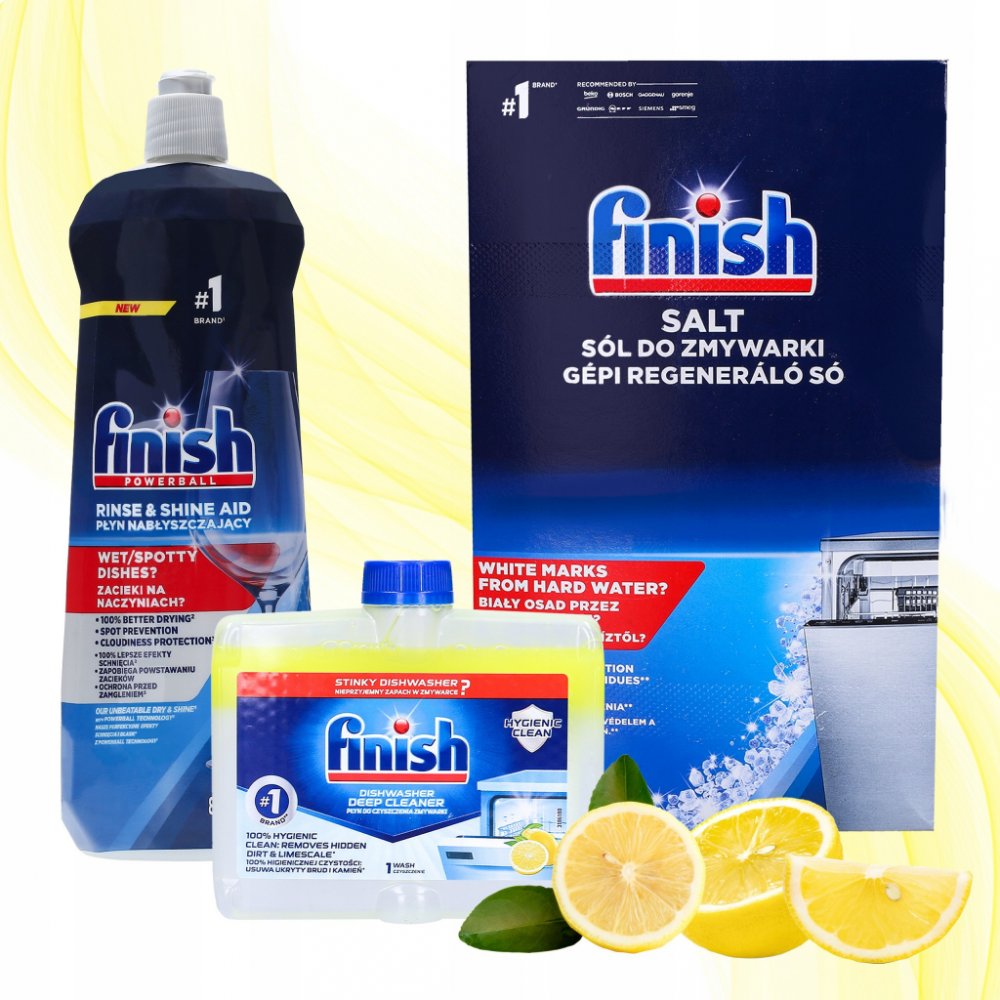 Finish Sůl nejen chrání zařízení před usazeninami vodního kamene a eliminuje skvrny na nádobí, ale také změkčuje vodu a zlepšuje fungování myčky. Dosáhne na těžko přístupná místa, např. ramena ostřikovačů a trubek. Podporuje účinek čisticího prostředku, aby bylo nádobí ještě čistší a lesklejší. Sůl Finish je doporučována předními výrobci myček nádobí.