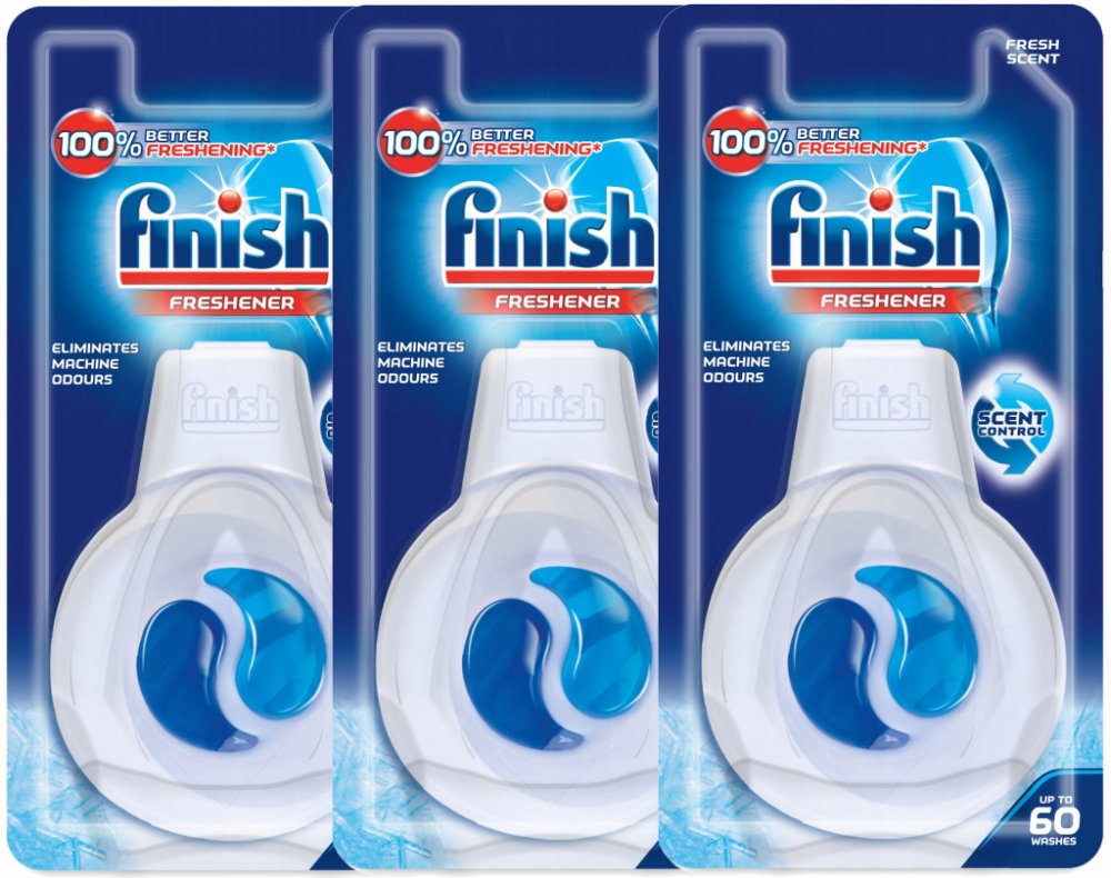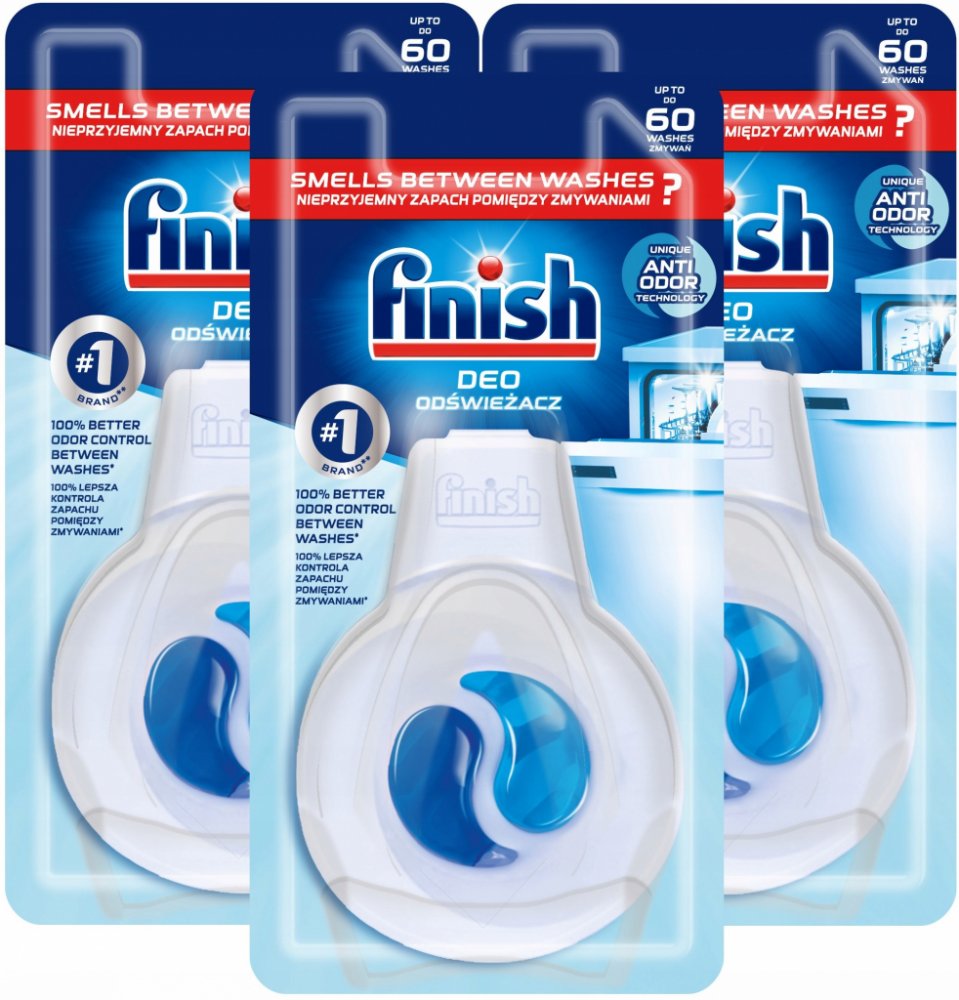 Osvěžovač do myčky Finish je jednoduchým řešením v boji proti nepříjemným pachům. Unikátní technologie Scent Control zajišťuje osvěžující, svěží vůni při každém otevření myčky. Ochranný filtr způsobuje, že zápach se uvolňuje pouze po ukončení mytí. Díky tomu osvěžovač eliminuje nepříjemné pachy, zajišťuje, že se neusazuje na nádobí a jeden přívěsek vystačí až na 60 mytí! Snadné upevnění.