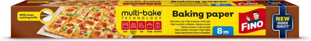 Ideální pro nízkokalorické pokrmy kde není třeba mastit formu nebo plech, pečivo a potraviny se pak jednoduše připravují a formy zůstávají čisté. Vhodný také pro zapékání a zabraňuje připálení, je oboustranný a použitelný na jakoukoliv formu nebo plech, archy přesně padnou na obvyklý plech o šířce 38 cm. Vlastnosti Fino pečící papír: role o délce 8 metrů šířka role 38 cm oboustranný