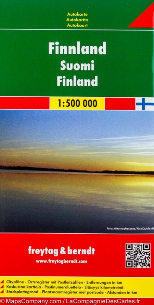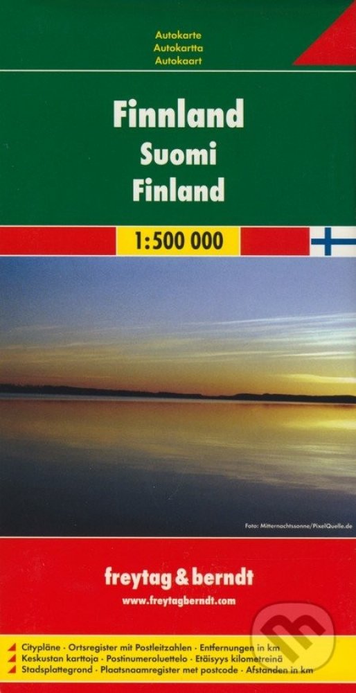 Oboustranná automapa Finska. Základem motoristického obsahu je podrobná silniční síť s kilometráží, čísly silnic, zvýrazněny jsou placené úseky, nebezpečné klesání a stoupání, benzínové stanice. Zaznačeny jsou přírodní a kulturní zajímavosti, úseky s panoramatickým výhledem, pamětihodnosti, možnosti ubytování. Reliéf je zakreslen pomocí stínování. Přiložena brožura s rejstříkem sídel, česká legenda. Vydání: Z důvodu časté aktualizace map Vám dotaz na rok vydání rádi zodpovíme telefonicky či emailem. Děkujeme za pochopení.