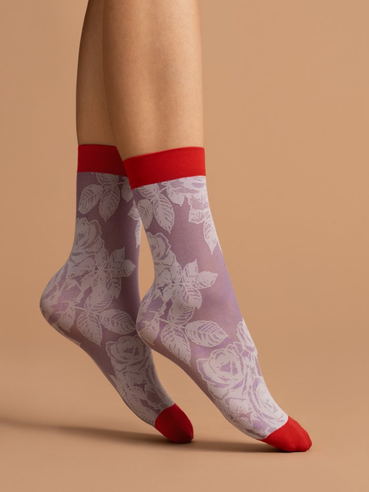 RED ROSE-vzorované ponožky 40den lila s červenou špicí pokračující v lila a červeným okrajem s bílými květy,vyrobené z příze typu elastan.Velikost univerzální,bez zesílené špice.