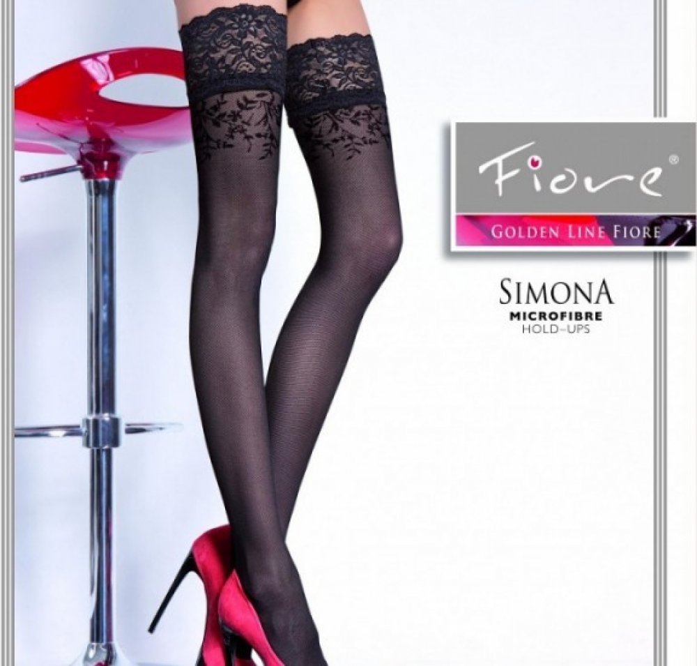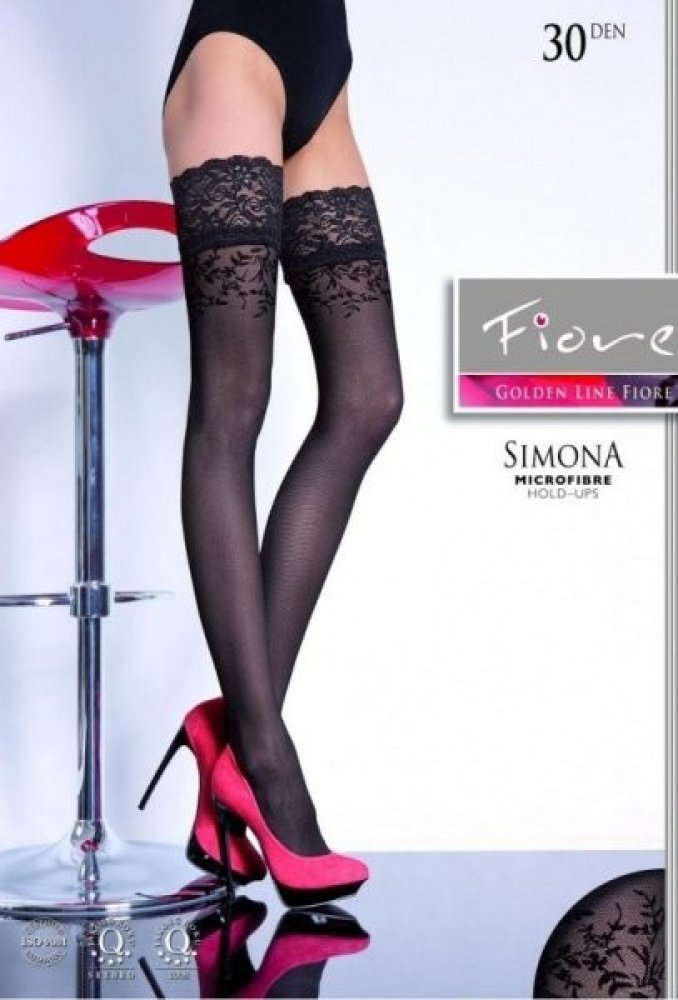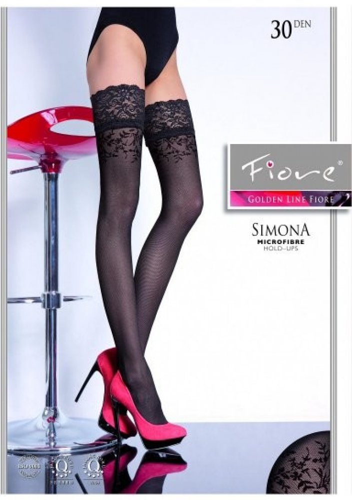Simona-luxusní vzorované samodržící punčochy 30den s velmi širokou krajkou a s neviditelně zesílenou špičkou,vhodné i do otevřených bot.Vyrobené z příze s podílem elastanu.