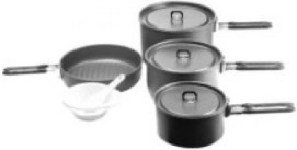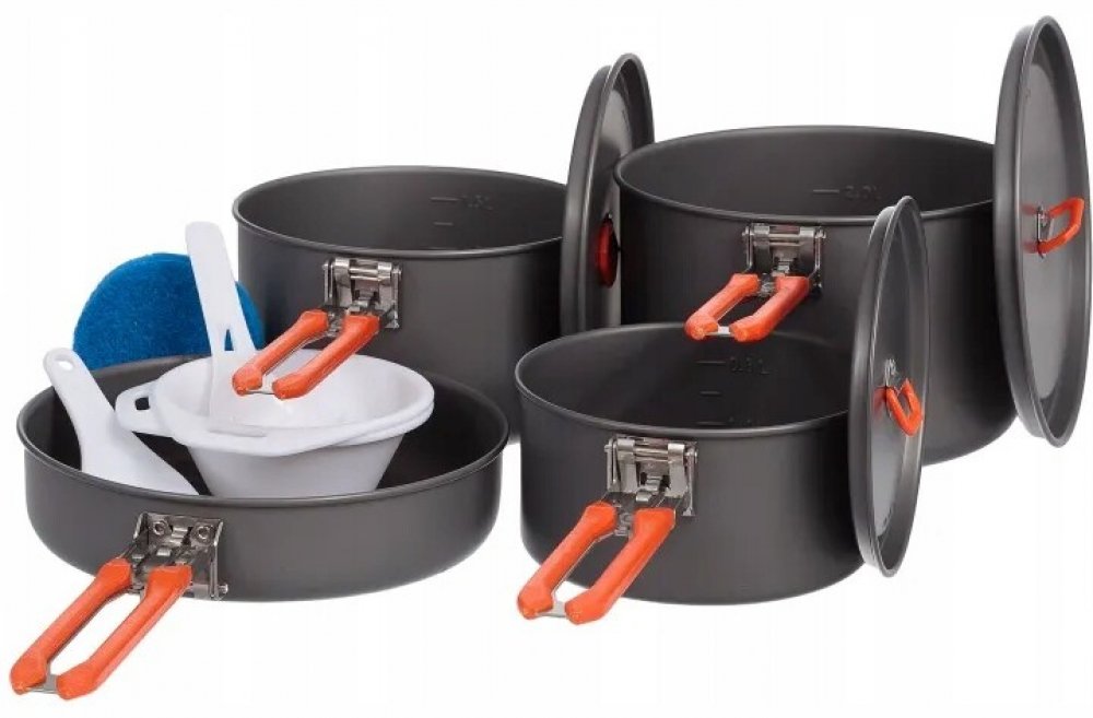 Bohatá sada turistického nádobí z eloxovaného hliníku.