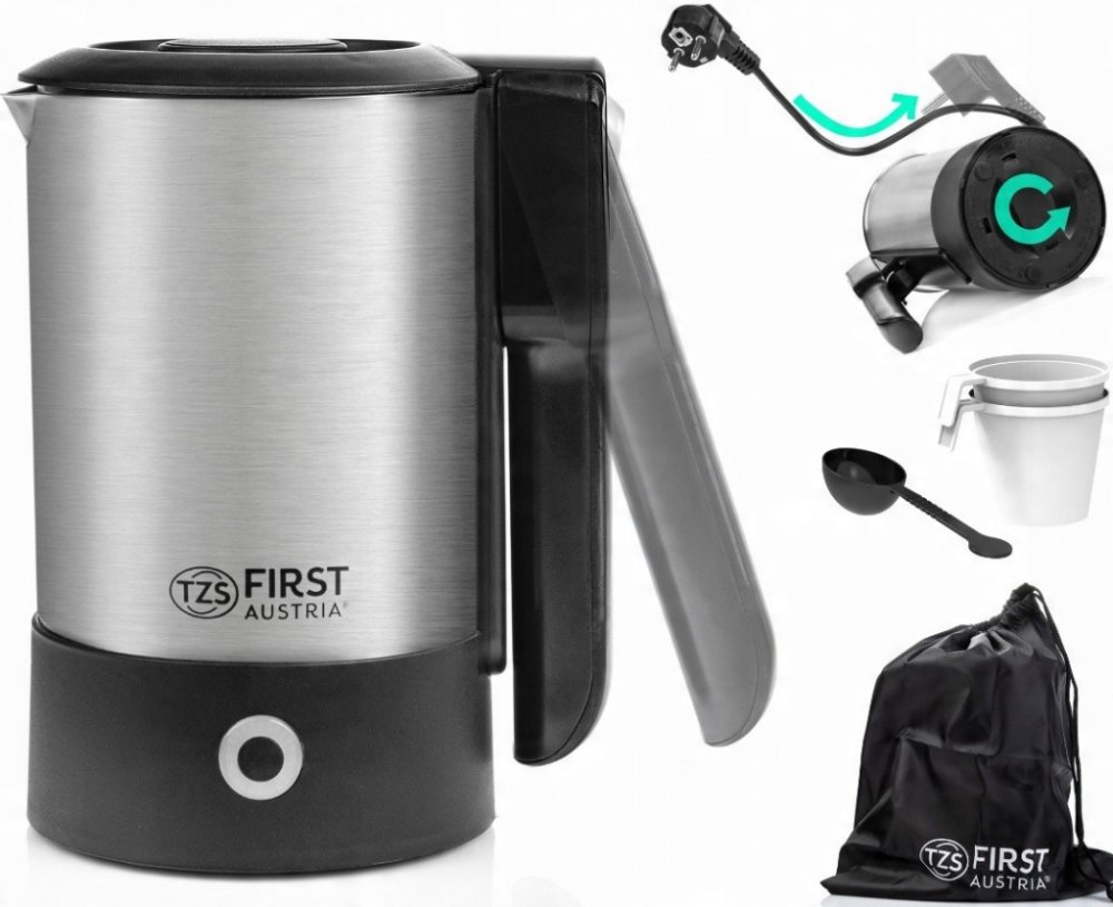 ⭐ TURISTICKÁ ELEKTRICKÁ KONVICE ZNAČKY FIRST AUSTRIA 0,6 L 1000 W + 2 ŠÁLKY A LŽIČKA ⭐⭐ TICHÝ HRDINA VAŠICH VÝLETŮ!