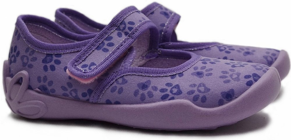 Textilní balerínkové bačkory se zapínáním na suchý zip. Velmi lehké, ohebné. Provětrávané do podešve. Podšívka jemné froté. Výhodou je mírná okopová špička. Bačkůrky jsou vhodné do interiéru, tedy např. do školky či školy.