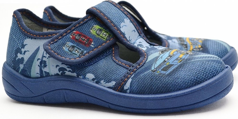 Textilní chlapecké bačkůrky se zapínáním na suchý zip. Výhodou je měkká stélka a ohebná podešev.