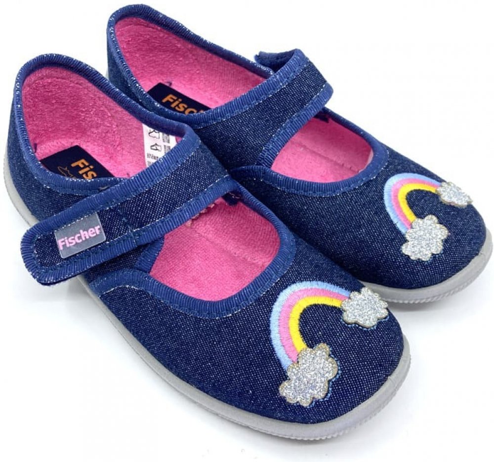 Džínové dívčí baleríny Fischer 632242 s výšivkou duhy sednou na úzké nožky. Podšívka je z růžového, bavlněného froté. Bačkory jsou velmi ohebné všemi směry, mají zpevněný opatek a nevyjímatelnou vnitřní stélku s měkkou textilní nášlapnou výplní. Podrážka je v šedé barvě s mírným vzorkem. Bačkory nezanechávají šmouhy na podlaze, jsou tedy vhodné do školy i školky. V přední i zadní části je podrážka...