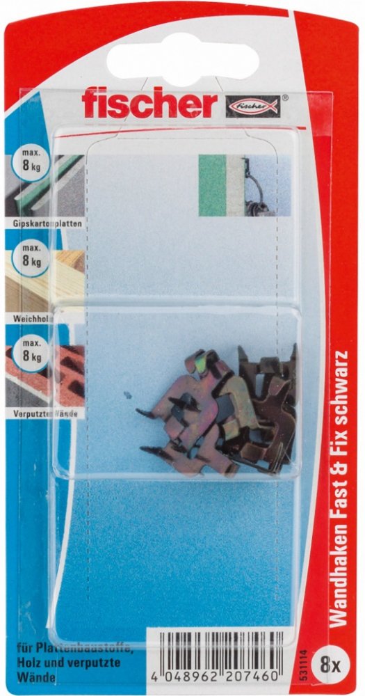 Fischer Fast & Fix háček na stěnu. Výhody: - Upevnění bez vrtání a zatloukání. To redukuje potřebnou práci a zabrání nepořádku. - Odstranění bez téměř žádných stop. - Znovupoužitelný, což snižuje náklady. - Maximální zatížení 8 kg na jeden háček. Zatížení až 16 kg při použití dvou háčků. Stavební materiály: - Sádrokartonové desky - Měkké dřevo - Omítka Princip funkce - montáž: - Při zatlačení do povrchu stěny se háček zajistí. Aplikace: - Obrazy - Oblečení - Klíče Obsah balení: - 8x háček Fast & Fix černé barvy
