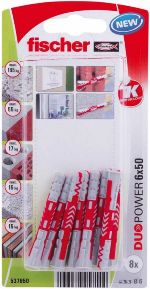 Hmoždinka Fischer DuoPower se skládá ze dvou syntetických materiálů - z nylonu a polypropylenu. Vizuálně lze od sebe části odlišit velice snadno - podle šedé a červené barvy. V závislosti na stavebním materiálu se hmoždinka DuoPower chová odpovídajícím a nejvhodnějším způsobem a tím zajišťuje nejvyšší nosnost v plném, děrovaném, ale i deskovém stavebním materiálu. Svou funkčností (uzlování, složení nebo rozpínání) otevírá v porovnání s běžnými hmoždinkami nové schopnosti uplatnění a aplikace ve všech známých typech stavebních materiálů. Hmoždinka je vhodná v kombinaci s běžnými vruty do dřevotřísky i kombišrouby. Hmoždinka je vhodná pro předsazenou i pro průvlečnou montáž. Použití: - Nástěnné skříňky - Police - Zrcadlové skříňky - Držáky na nástroje, ručníky a další. - Těžká zrcadla - Šatní skříně - Další aplikace Stavební materiály: - Pevné cihly - Pevné vápenopískové cihly - Pórobeton - Svisle děrované cihly - Děrované vápenopískové cihly - Sádrokarton - Sádrokartonové a sádrovláknité desky - Dutinové tvárnice z lehkého betonu - Dutinové podlahové desky vyrobené z cihel, betonu apod. - Přírodní kámen - Dřevotříska - Pevné panely vyrobené ze sádry - Masivní cihly z lehkého betonu