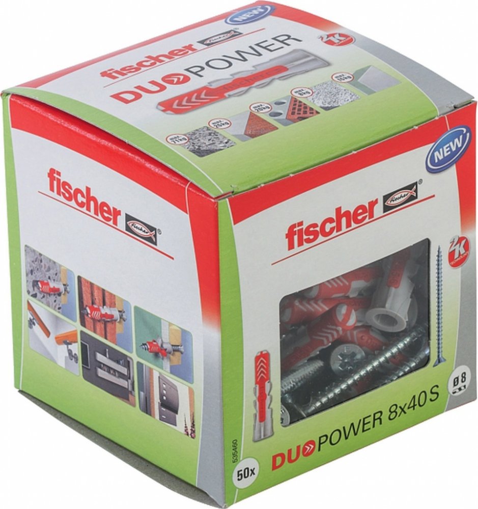 Hmoždinka Fischer DuoPower se skládá ze dvou syntetických materiálů - z nylonu a polypropylenu. Vizuálně lze od sebe části odlišit velice snadno - podle šedé a červené barvy. V závislosti na stavebním materiálu se hmoždinka DuoPower chová odpovídajícím a nejvhodnějším způsobem a tím zajišťuje nejvyšší nosnost v plném, děrovaném, ale i deskovém stavebním materiálu. Svou funkčností (uzlování, složení nebo rozpínání) otevírá v porovnání s běžnými hmoždinkami nové schopnosti uplatnění a aplikace ve všech známých typech stavebních materiálů. Hmoždinka je vhodná v kombinaci s běžnými vruty do dřevotřísky i kombišrouby. Hmoždinka je vhodná pro předsazenou i pro průvlečnou montáž. Použití: - Nástěnné skříňky - Police - Zrcadlové skříňky - Držáky na nástroje, ručníky a další. - Těžká zrcadla - Šatní skříně - Další aplikace Stavební materiály: - Pevné cihly - Pevné vápenopískové cihly - Pórobeton - Svisle děrované cihly - Děrované vápenopískové cihly - Sádrokarton - Sádrokartonové a sádrovláknité desky - Dutinové tvárnice z lehkého betonu - Dutinové podlahové desky vyrobené z cihel, betonu apod. - Přírodní kámen - Dřevotříska - Pevné panely vyrobené ze sádry - Masivní cihly z lehkého betonu