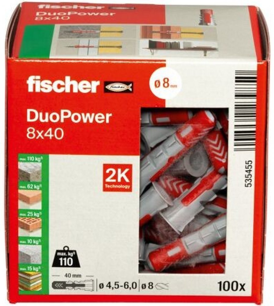 Hmoždinka fischer DuoPower 8x40 mm je vysoce kvalitní řešení pro pevné a bezpečné kotvení do plných, děrovaných i dutých materiálů. Díky inovativnímu spojení dvou plastů se sama přizpůsobí danému podkladu a zvolí nejvhodnější způsob kotvení – rozepření, složení nebo uzlování.