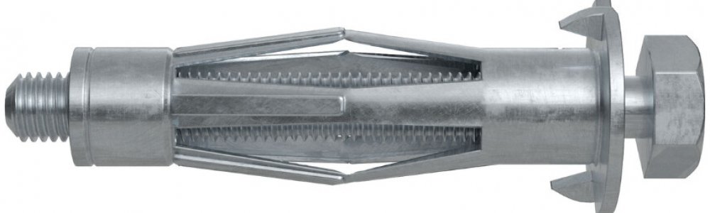 Ocelová hmoždinka pro upevňování do dutých materiálů. Montáž pomocí šroubováku nebo montážních kleští. Díky zoubkům na límci hmoždinky se při montáži neprotáčí.