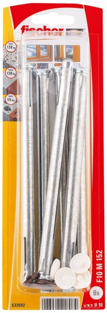 Rámová kovová hmoždinka Fischer F 10 M je speciální kotevní prvek pro beznapěťové distanční upevnění okenních a dveřních rámů. Skládá se z kovového pláště, rozpěrného kužele a šroubu se zápustnou hlavou z galvanicky zinkované oceli. Průvlečná montáž šetří čas. Utahováním šroubu je kužel vtahován do pláště, který se zapře o stěnu vyvrtaného otvoru. Tím se okenní rám bezpečně a bez napětí ukotví v plném a děrovaném stavebním materiálu. Hmoždinka F 10 M je vhodná k upevnění dřevěných a okenních rámů či dřevěných hranolů. Použití: - Okenní rámy - Rámy dveří - Hranoly Stavební materiál: - Beton - Svisle děrované cihly - Dutinové panely z lehčeného betonu - Děrované vápenopískové cihly - Plné vápenopískové cihly - Pórobeton - Plné tvárnice z lehčeného betonu - Plné cihly