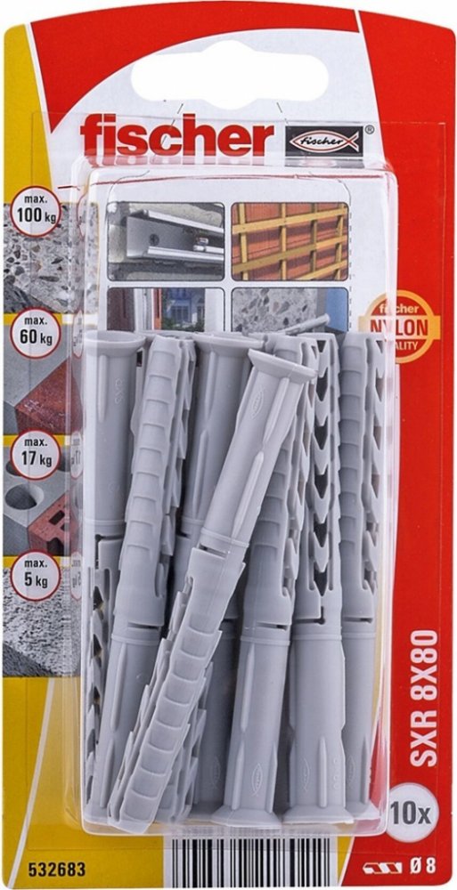 Fischer rámové hmoždinky SXR jsou vyrobené z kvalitního nylonu. Díky speciální geometrii lze SXR hmoždinky aplikovat do plných a děrovaných stavebních materiálů. Rámovou hmoždinku lze použít pro výjimečně hospodárné upevňování díky malé kotevní hloubce pouhých 30 mm. Fischer rámová hmoždinka SXR je vhodná k upevnění tesařských konstrukcí, věšáků či svítidel. Rámová hmoždinka SXR je vhodná pro průvlečnou montáž. V plných materiálech se hmoždinka SXR rozepře. V dutinových a děrovaných materiálech vytvoří SXR tvarový zámek a zatížení se přenáší přepážkami ve struktuře zdiva. Duté cihly vrtejte pouze rotačním vrtáním (bez příklepu). Použití: - Nosné dřevěné konstrukce - Rolety/žaluzie - Madla - Skříně - Nástěnné regály - Osvětlení - Pohybová čidla - Obložení stěn - Kovové konzole - Kovové sloupky a podpěry - Elektroinstalace - Kabelové lávky Stavební materiály: - Svisle děrované cihly - Pórobeton - Dutinové panely z lehčeného betonu - Děrované vápenopískové cihly - Tepelně izolační desky - Plné bloky z lehčeného a normálního betonu - Plné cihly - Plné vápenopískové cihly - Beton C12/C15 - Přírodní kámen s celistvou strukturou - Sádrokartonové desky
