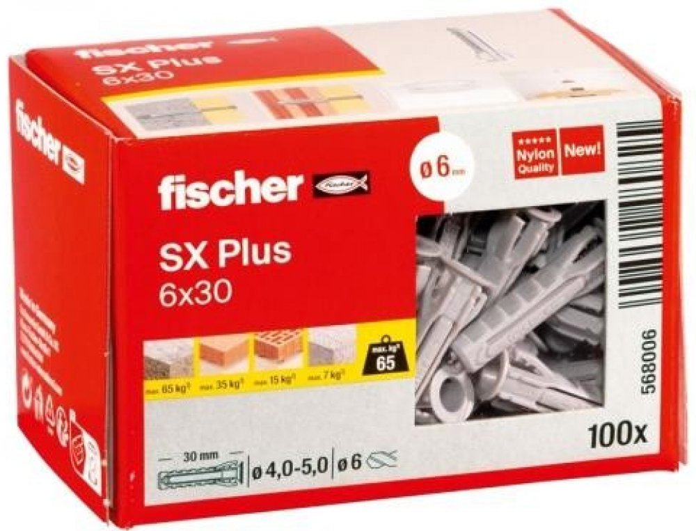 Fischer SX Plus 6x30 mm (568006), balení 100 ks Hmoždinky vhodné převážně do plných materiálů, ve kterých perfektně drží díky rozpínání do 4 stran. Oproti předchozí verzi hmoždinky SX má verze Plus pojistná křidélka, která drží vrut v hmoždince už před utažením, což velmi usnadní montáž hlavně do stropu. Hladký povrch hmoždinky v neroztaženém stavu usnadňuje vložení do vyvrtaného otvoru a límeček zabraňuje zapadnutí hmoždinky.