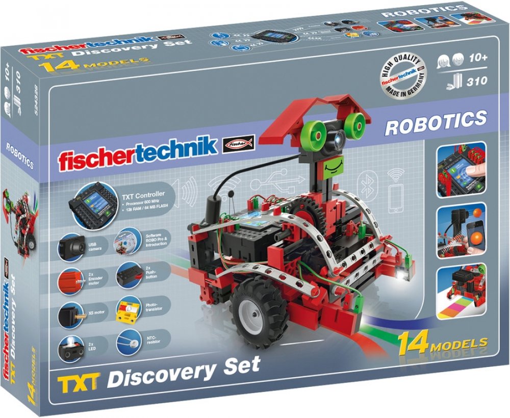 Robotická stavebnice s 310 díly, novým ROBOTIC TXT ovladačem a rozšířeným softwarem ROBO Pro pro ovládání mobilních i nepohyblivých robotů. Kamera umožňuje zasílání obrazu pomocí USB nebo WiFi, rozeznávání barev, jízdu po vyznačené trase a detekci pohybu.