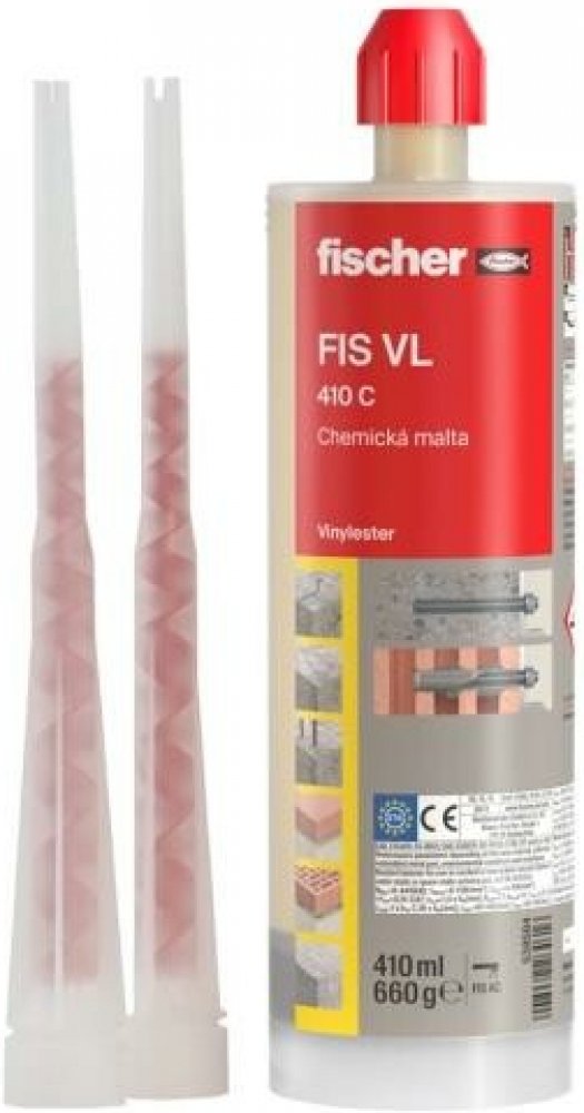 Fischer VL 410 C (538584) Chemická injektážní malta, dodávana včetně dvou míchacích trysek, je na bázi hybridní vinylesterové pryskyřice bez obsahu styrenu. Tato chemická kotva je vhodná i pro to nejvyšší zatížení téměř ve všech stavebních materiálech. Dosahuje vysokých únosností a je certifikovaná pro široké spektrum kotevních aplikací, včetně tažené zóny betonu. Kotva má vysokou požární odolnost...