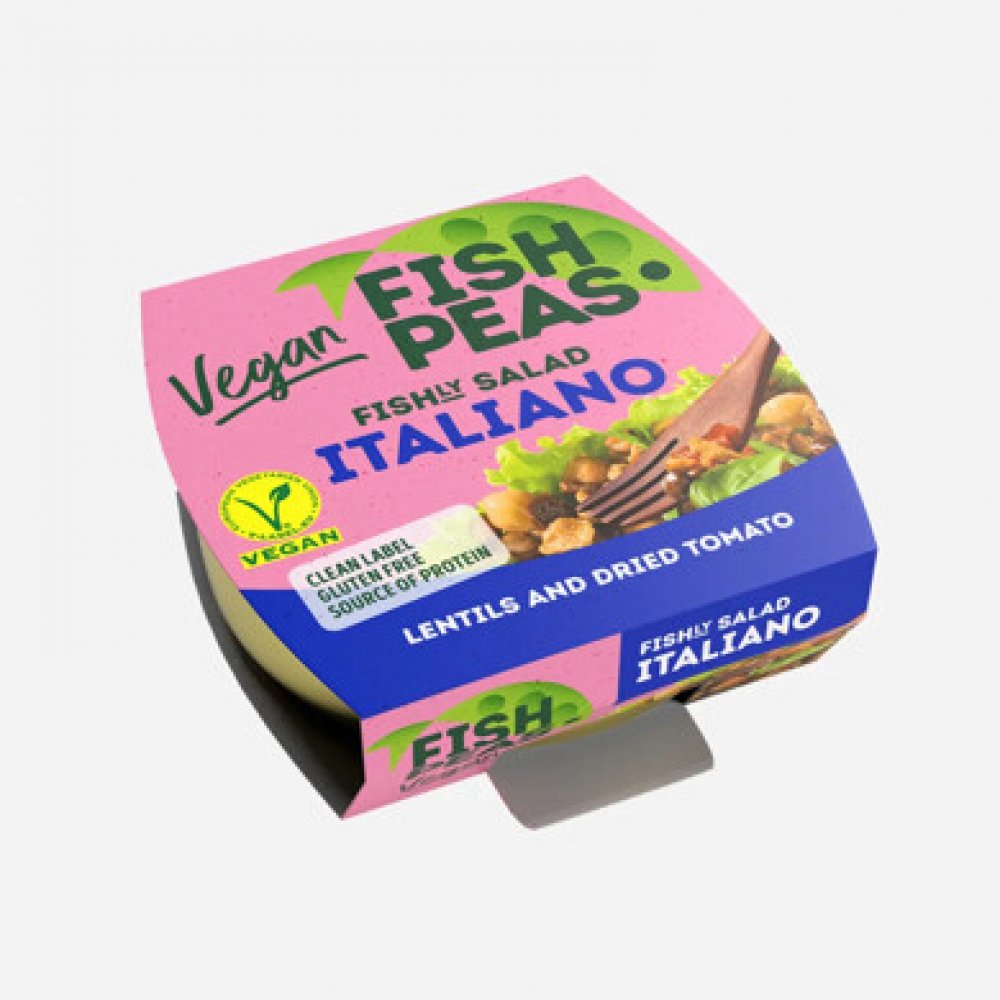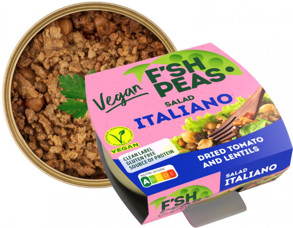 Fish Peas Veganský salát s hrachovou bílkovinou Italiano 175 g. Veganské výrobky představují rostlinnou alternativu rybích konzerv. Jsou vyrobeny z bílkoviny ze žlutého hrachu, která patří mezi nejudržitelnější rostlinnou bílkovinu vzhledem k uhlíkové stopě.Tento salát je vhodný pro všechny, kteří si chtějí pochutnat bez masa. Složení: Zelenina a luštěniny v různém poměru 50 % (cizrna, čočka, čer...