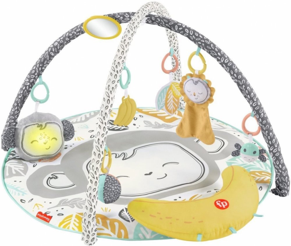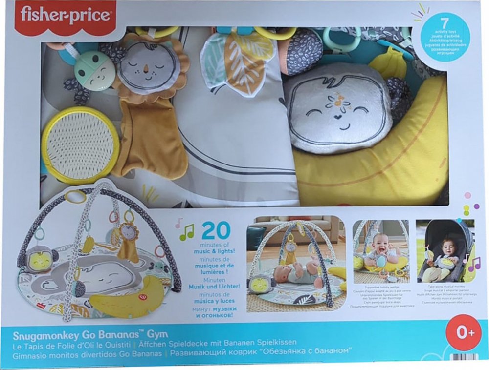 Velká dečka má pro miminko mnoho překvapení, které může objevit, a 2 tyče pro nastavení 7 hraček. Polštář pod bříško ve tvaru banánu nabízí dítěti oporu. Přenosná opička nabízí 20 minut hudby, zvuků a světel.
