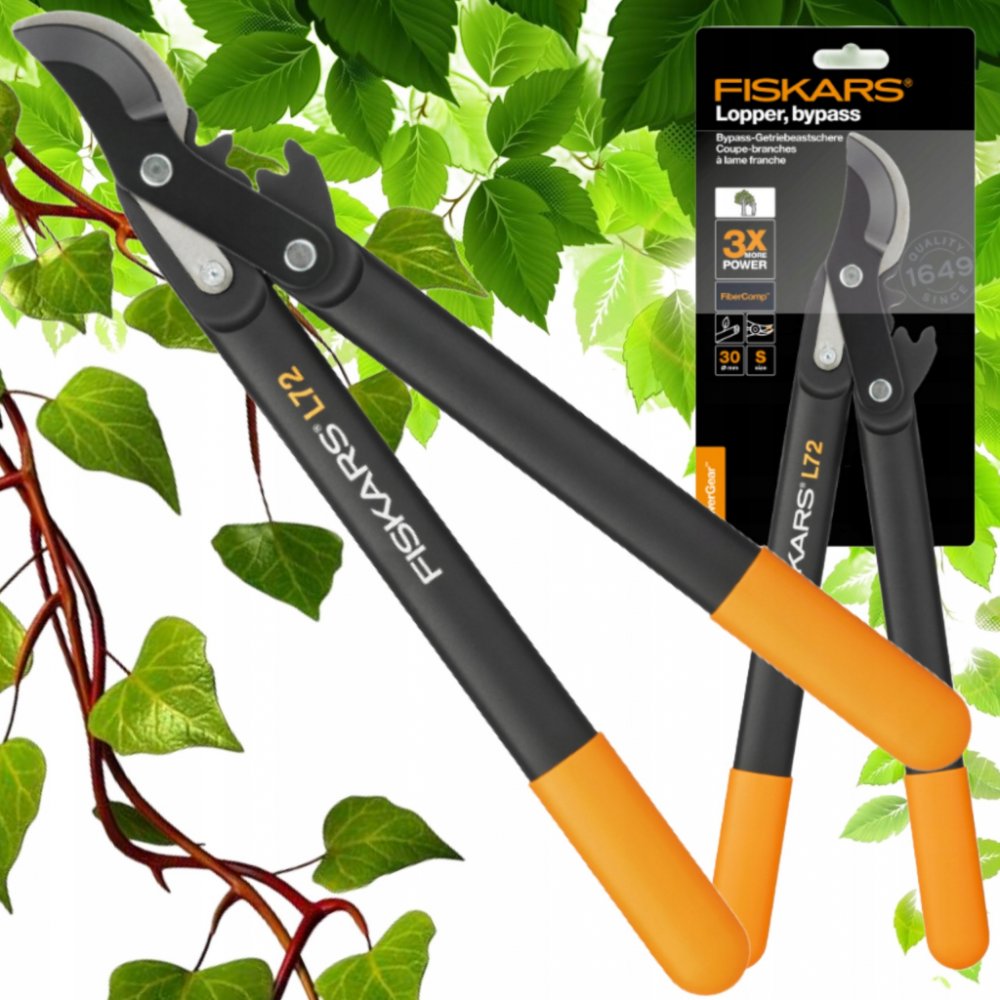 Dvouruční nůžky Fiskars se dodávají ve třech typech: jednočepelové, dvoučepelové se spodní čepelí ve tvaru háku nebo ve tvaru běžných zahradních nůžek. Jednočepelové nůžky jsou určené pro střihání suchého a tvrdého dřeva.