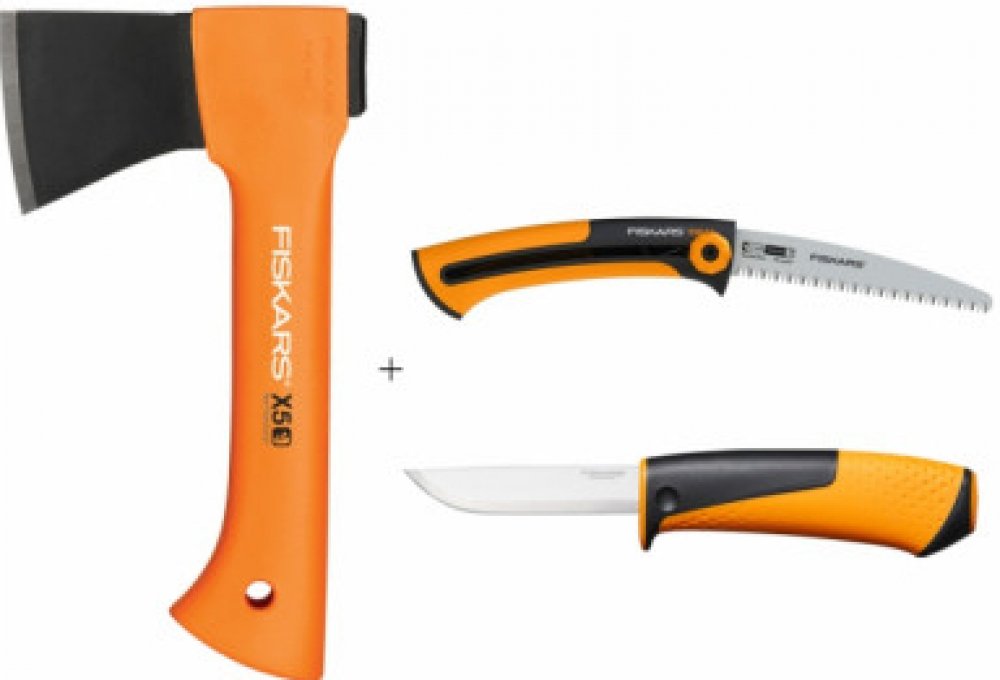 Kempinková sada Fiskars obsahuje sekeru X5, pilku Xsharp SW 73 a univerzální nůž Fiskars Hardware.Univerzální sekera Fiskars X5 je malá, lehká a účinná sekera vhodná pro přípravu dřeva na oheň při kempování. Perfektně vyvážená sekera má tenkou širší čepel, která je vhodná k odvětvování stromů a na další lesní práce, můžete použít i jako náhradu za nůž a je vhodná na trempování. Sekerka se snadno přenáší díky klipu na opasek a velice snadno se skladuje díky malým rozměrům. Lehké topůrko z kompozitního pevného materiálu FiberComp (vyztuženého skelnými vlákny) snižuje únavu při práci. Kluzná povrchová vrstva z PTFE chrání sekyrku proti korozi a snižuje tření. Sekerku dodáváme v šitém pouzdře pro snadné skladování. Sekera váží 0,48 kg, její délka je 22,8 cm a šířka je 12,5 cm.Univerzální nůž Fiskars pro široké použití s plastovým krytem (pochvou). Ergonomicky tvarovaná rukojeť s ochranou proti sklouznutí ruky. Čepel o délce 100 mm z nerezavějící švédské oceli. Dodáván s plastovým pouzdrem.Zahradní zasouvací pilka Fiskars je určena k řezání čerstvého dřeva. Délka čepele 160 mm. Řeže větve do průměru 70 mm. Rukojeť s měkkým povrchem SoftGrip pro pevný a pohodlný úchop. Nový design s praktickou zatahovací sponou na opasek. Bezpečnostní zarážka brání sklouznutí prstů.