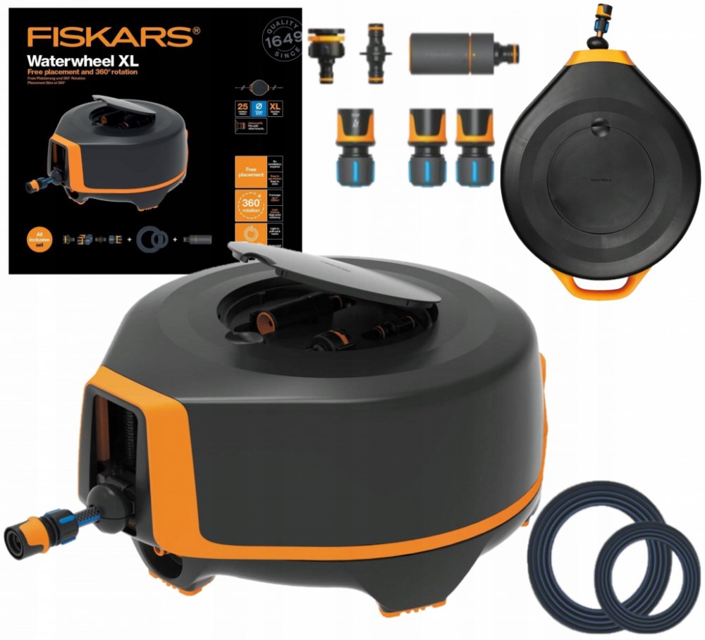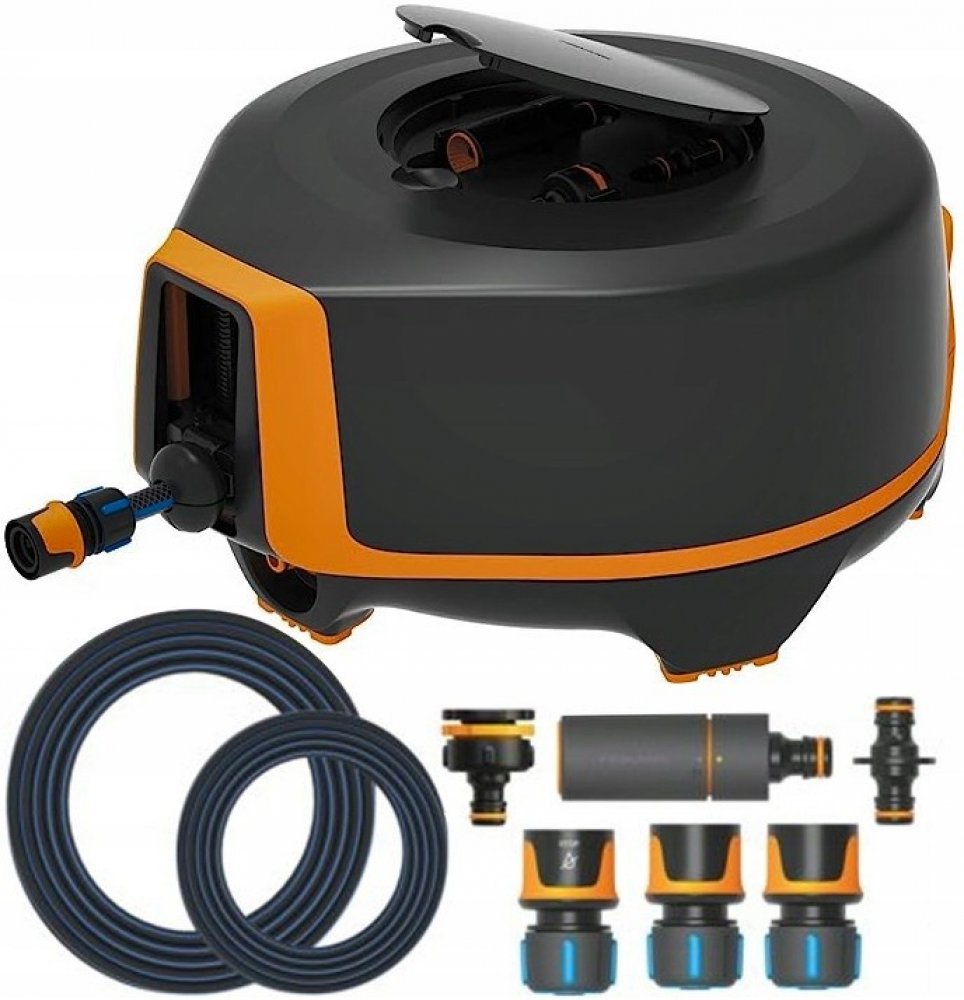 - Obsahuje vysoce kvalitní zavlažovací hadici s automatickým navíjením, nastavitelnou zavlažovací trysku a potrebné spojky pro hadice.